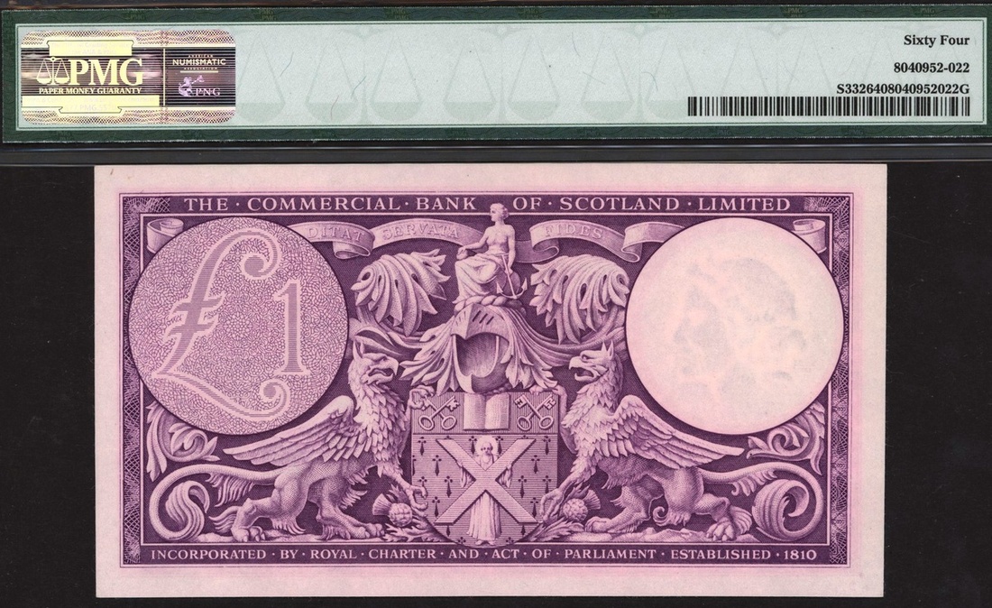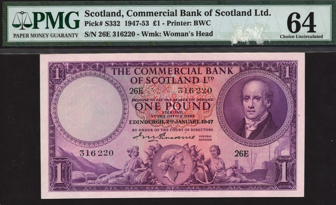 (x) Commercial Bank of Scotland, £1, 2 January 1947, serial number 26E 316220, (PMS CO65, Pick S332), first date, in PMG holder 64 Choice Uncirculated, scarce in high grade