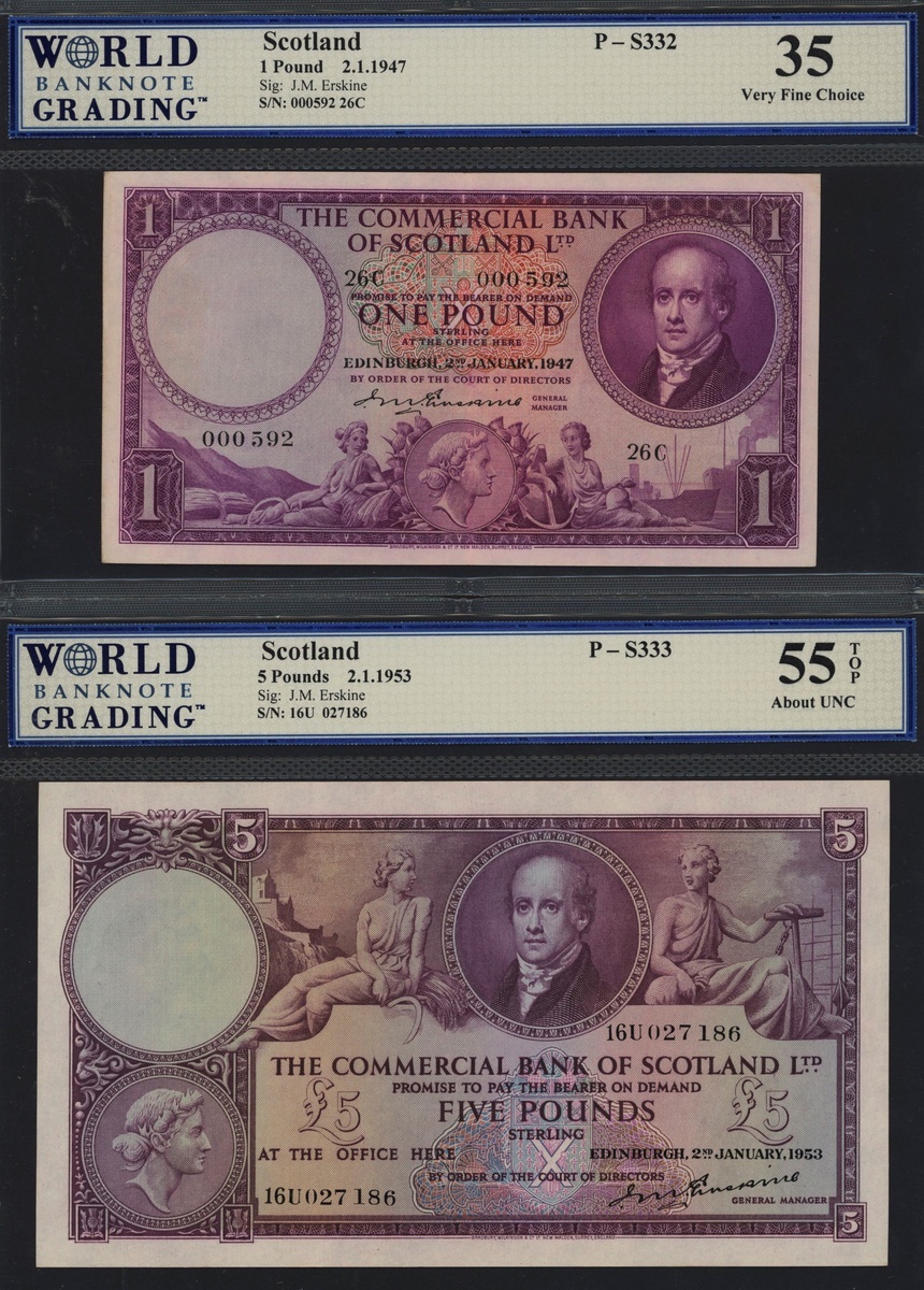 (x) Commercial Bank of Scotland Limited, £5, 2 January 1953, serial number 16U 027 186, also £1, 1947,