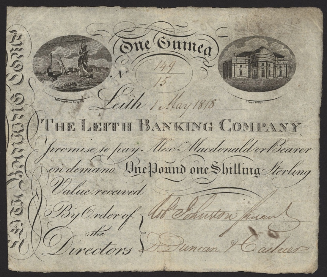 (x) Leith Banking Company, 1 guinea, 1 May 1818, serial number 149/15, (PMS LB5b), centre hole from folding, annotations at reverse, about very fine, scarce