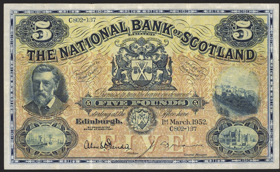 (x) A pair of Scottish large size £5s, including Commercial Bank of Scotland £5 1941, National Bank of Scotland £5 1952, (PMS CO62d, NA75), both very fine (2 notes)