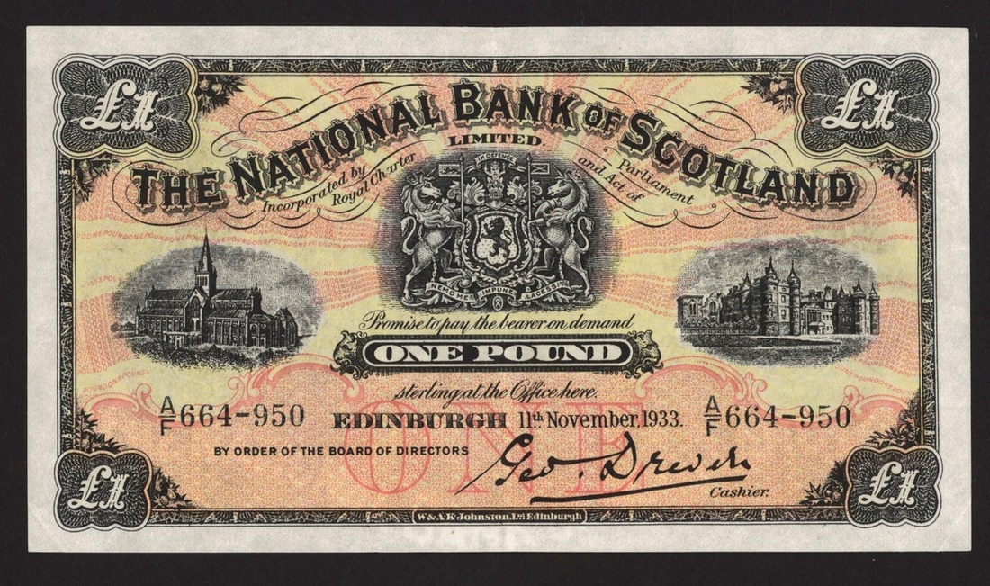 (x) National Bank of Scotland, £1, 11 November 1933, serial number A/F 664-950, (PMS NA45), pressed extremely fine
