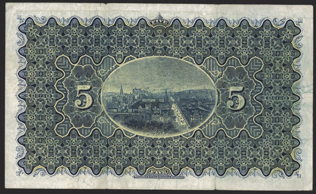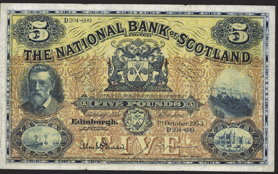 (x) The National Bank of Scotland, 5 pounds, 1953, serial number D204-699, (Pick 259d, PMS NA 57), minor split at top margin, pressed very fine
