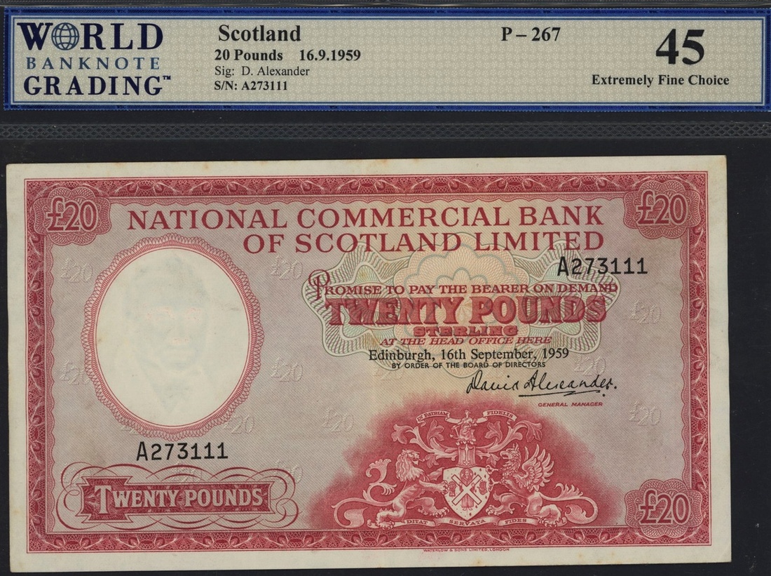 (x) National Commercial Bank of Scotland, £20, 16 September 1959, serial number A273111, (PMS NC4, Pick 267), in WBG holder 45 Extremely Fine Choice