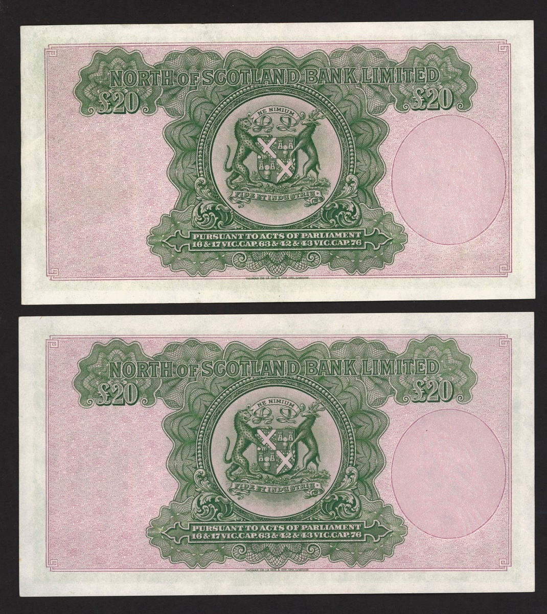 North of Scotland Bank Limited, £20 (2), 1949, prefixes NT, PT, (PMS NS45b), both with one centre crease, handling, good extremely fine (2 notes)