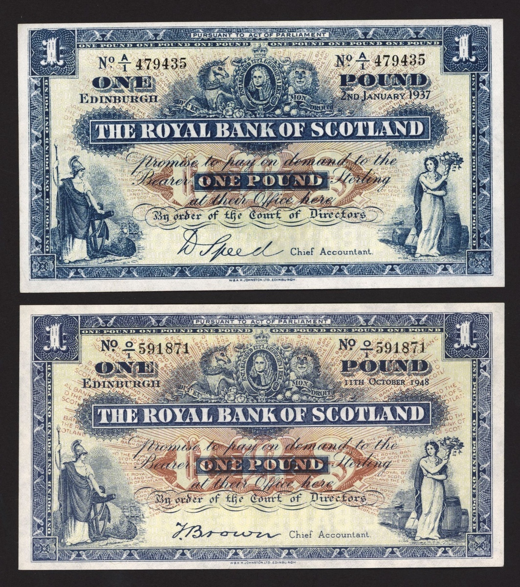 (x) The Royal Bank of Scotland, Scotland, £1 (2), 1937, 1948, prefixes A/1, O/1, (PMS RB55a, d), both pressed, about extremely fine (2 notes)
