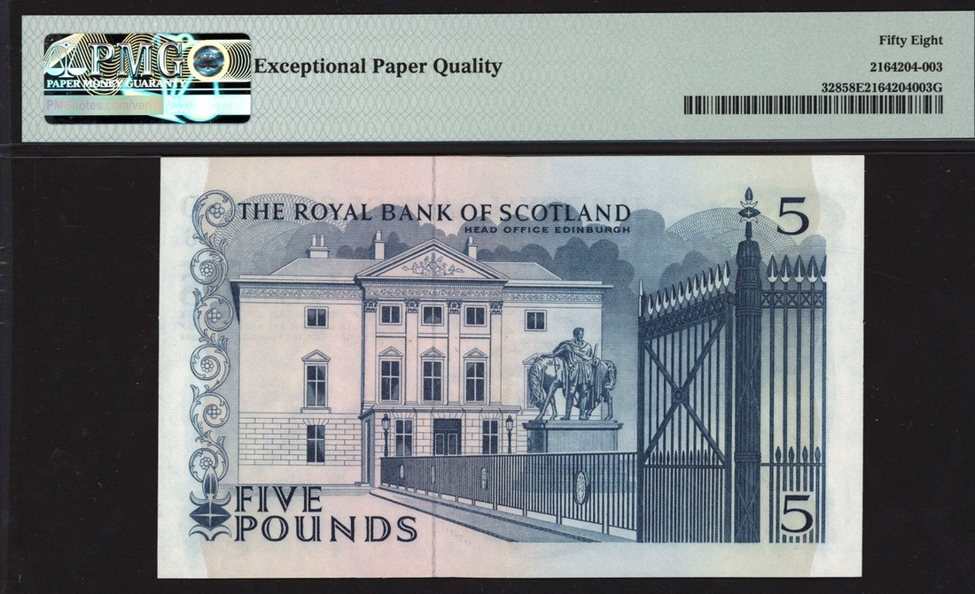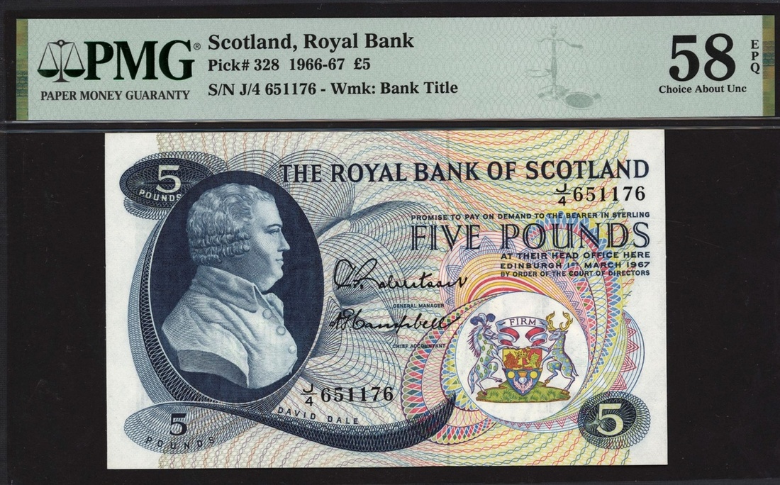 Royal Bank of Scotland, £5, 1 March 1967, serial number J/4 651176, (PMS RB64, Pick 328), in PMG holder 58 EPQ Choice About Unc