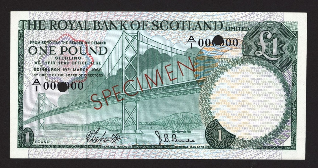 Royal Bank of Scotland Limited, specimen £1, 19 March 1969, serial number A/1 000000, (PMS RB68, Pick 329as), perforated, red SPECIMEN overprints, uncirculated