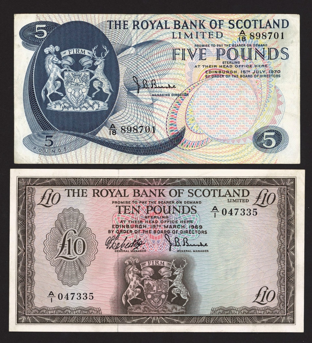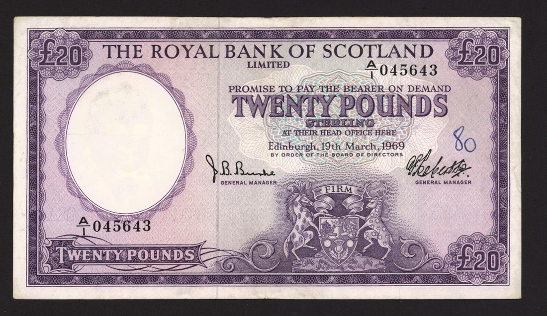 Royal Bank of Scotland, £20, 19 March 1969, serial number A/1 045643, also £10 1969, prefix A/1, and £5 1970 prefix A/18,
