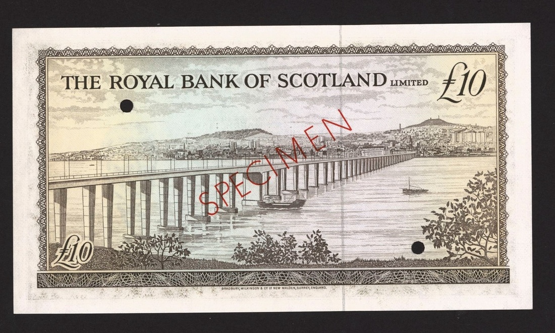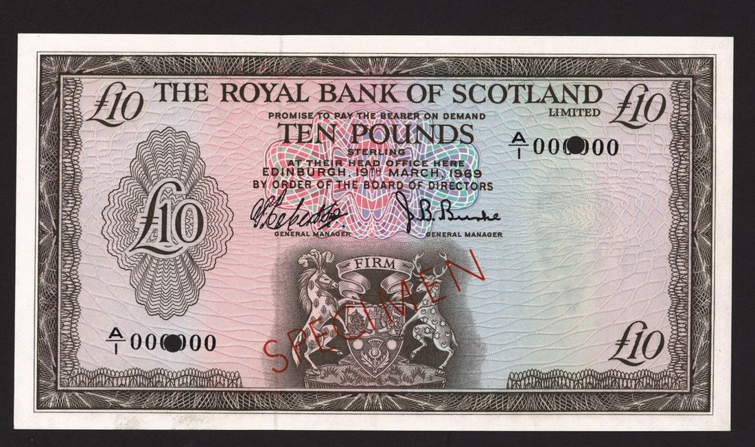 Royal Bank of Scotland Limited, specimen £10, 19 March 1969, serial number A/1 000000, (PMS RB72s, Pick 331a), perforated, red SPECIMEN overprints, uncirculated