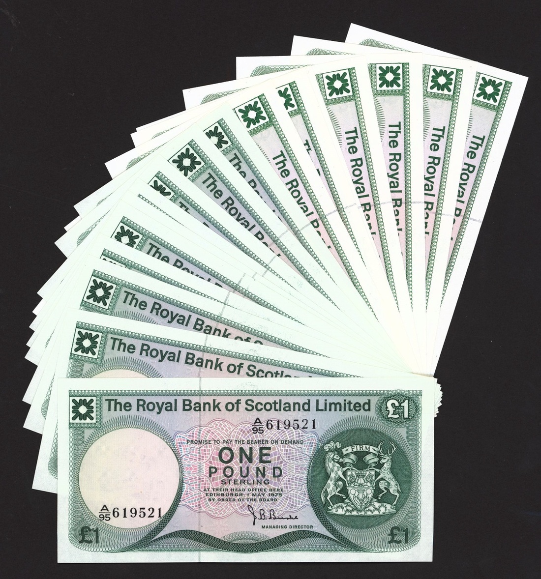 Royal Bank of Scotland, two consecutive runs of £1 (19), 1975, 1986, prefixes A/95, D/68, (PMS RB75, 80d), uncirculated (19 notes)