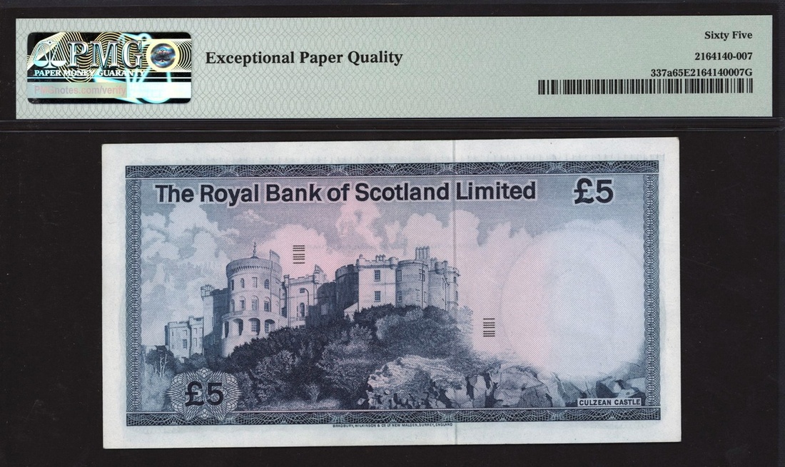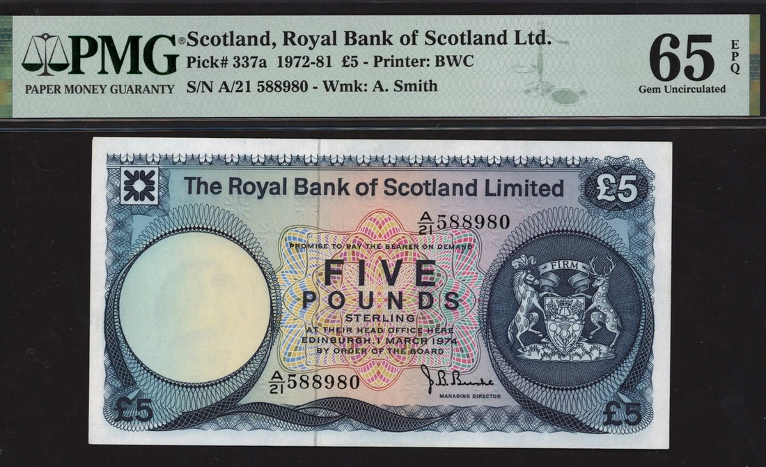 Royal Bank of Scotland Limited, £5, 1 March 1974, serial number A/21 588980, (PMS RB76, Pick 337a), in PMG holder 65 EPQ Gem Uncirculated