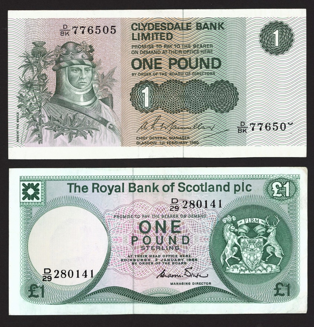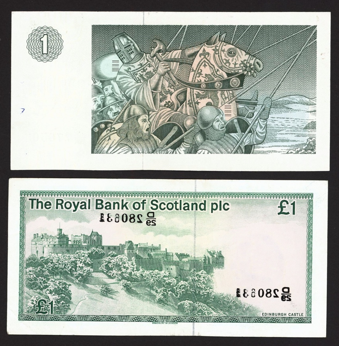 Scotland, a pair of ERROR £1s, Clydesdale £1 1980 (one dropped serial number digit), Royal Bank of Scotland Plc £1 1985 (serial number of another note printed at reverse),