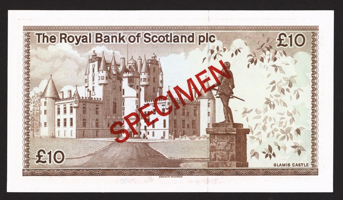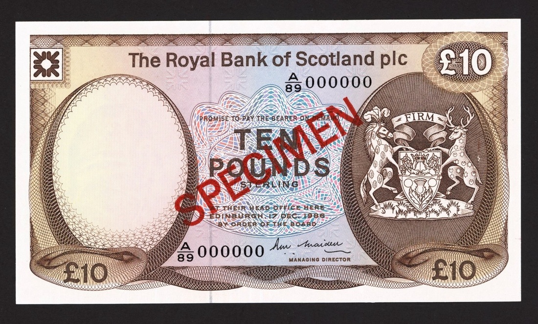 Royal Bank of Scotland Plc, specimen £10, 17 December 1986, serial number A/89 000000, signature Maiden,