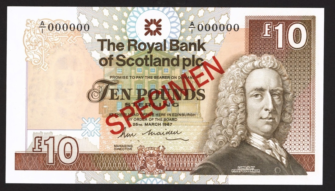 Royal Bank of Scotland Plc, specimen £10, 25 March 1987, serial number A/1 000000, (PMS RB87, Pick 348as), red SPECIMEN overprints, uncirculated