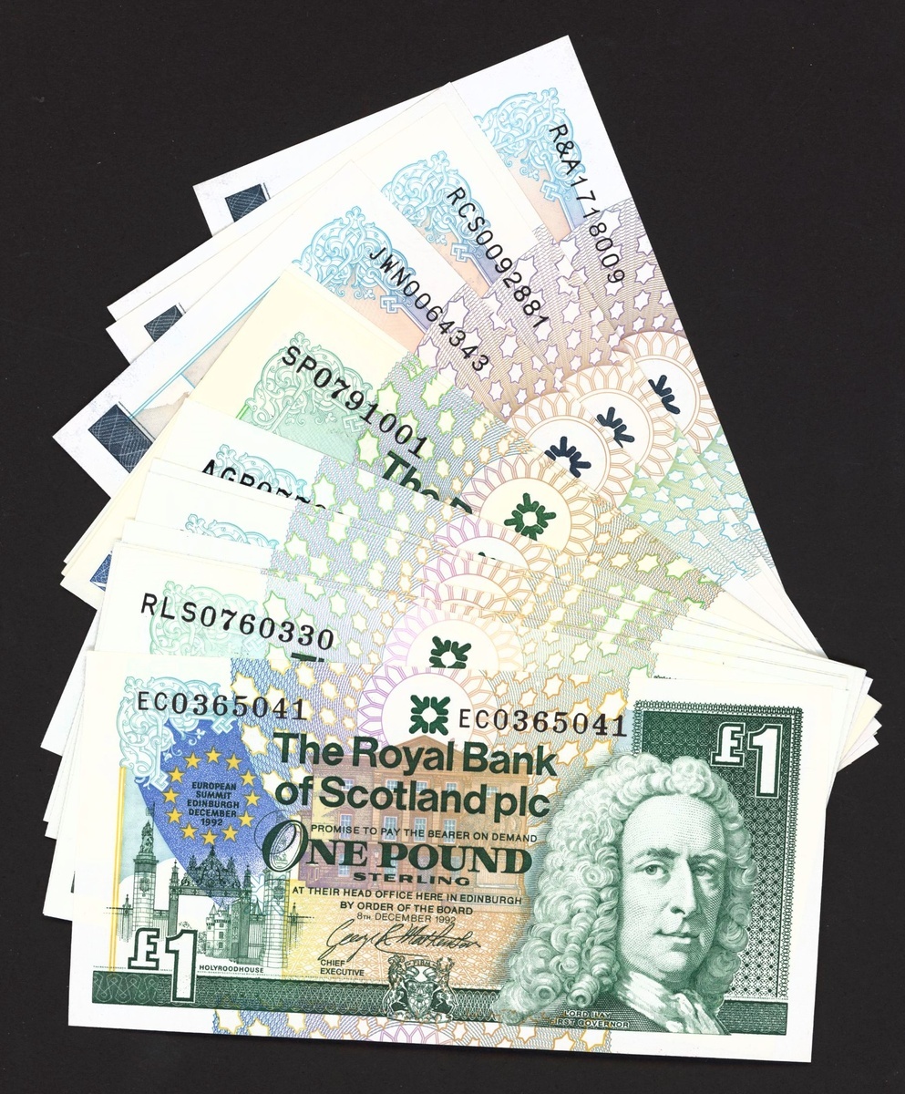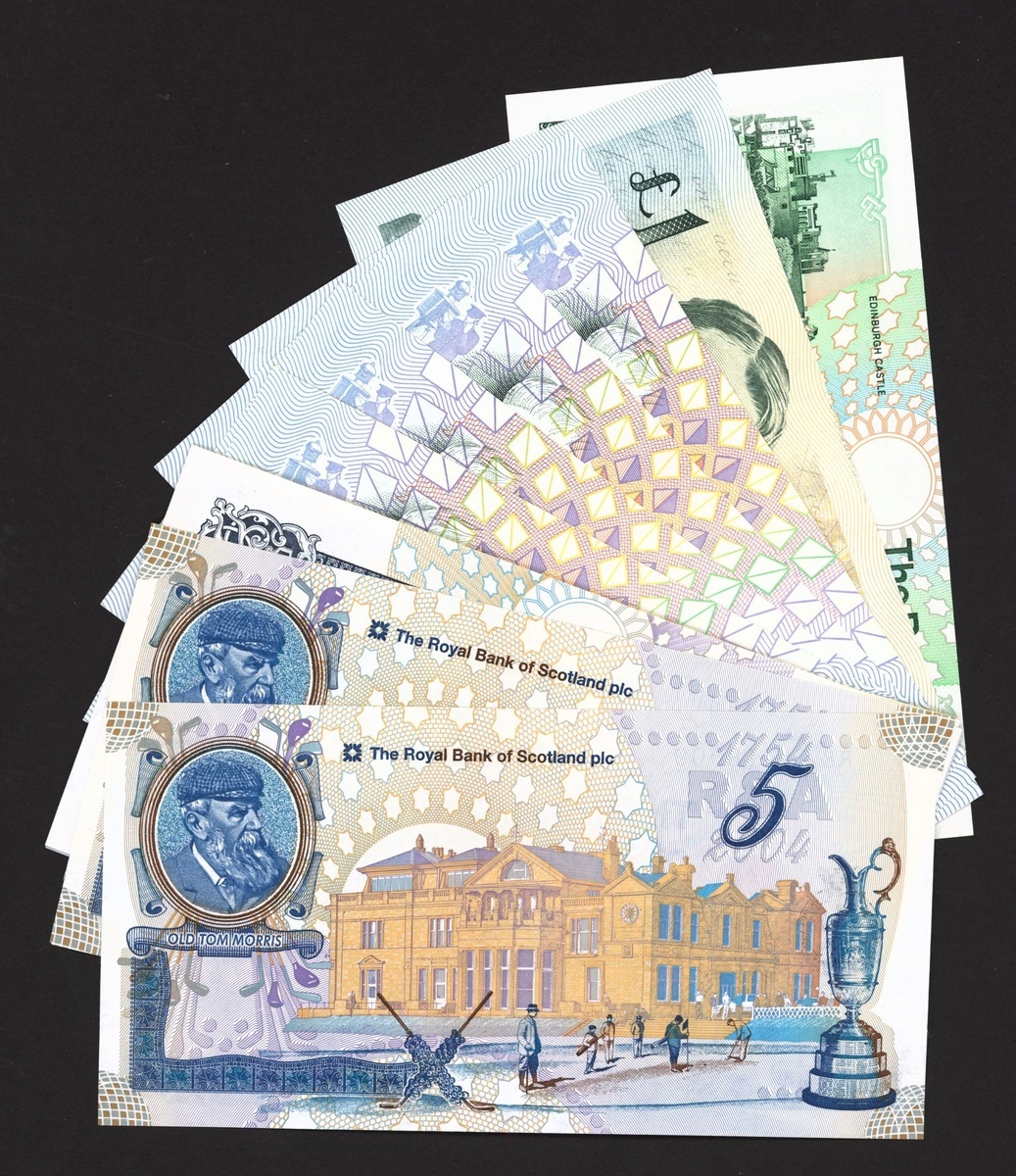 Royal Bank of Scotland Plc, a group of commemorative issues, including European Community Summit £1 1992, Robert Louis Stevenson £1 1994, Alexander Graham Bell consecutive £1 (9) 1997, Scottish Parliament £1 (4) 1999, Royal & Ancient Golf £5 (2) 2004, Royal College of Surgeons £5 2005, Jack W Nicklaus £5 2005,