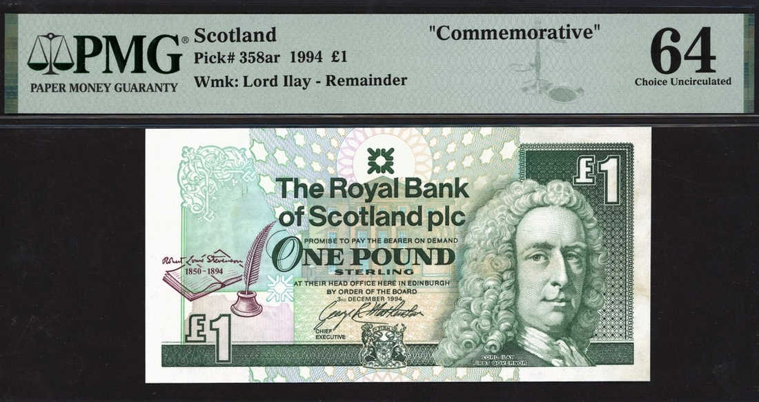 (x) Royal Bank of Scotland Plc, £1, 3 December 1994, no serial numbers, (PMS RB94, Pick 358ar, 'Robert Louis Stevenson' commemorative, in PMG holder 64 Choice Uncirculated