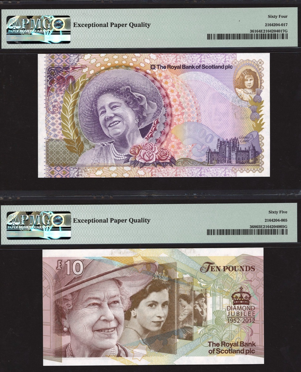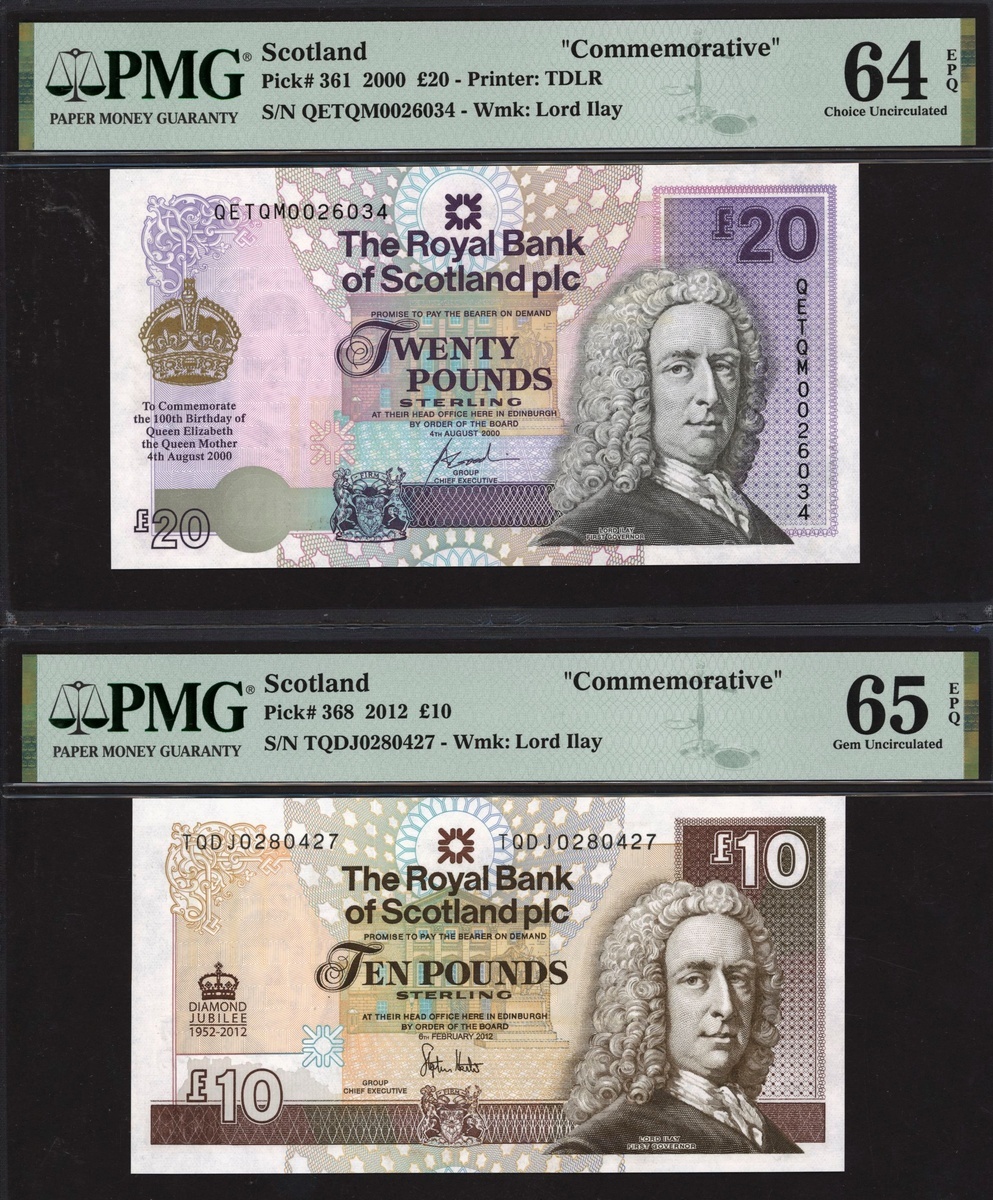 Royal Bank of Scotland, £20 and £10, 2000, 2012, prefix QETQM and TQDJ, (PMS RB104, 106, Pick 361, 368), a pair of the royal commemoratives, in PMG holders 64 EPQ, 65 EPQ (2 notes)