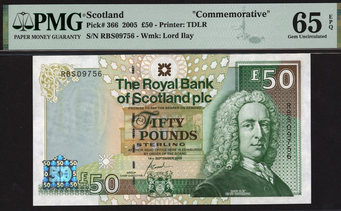 Royal Bank of Scotland, commemorative £50, 14 September 2005, serial number RBS09756, (PMS RB108, Pick 366), in PMG holder 65 EPQ Gem Uncirculated