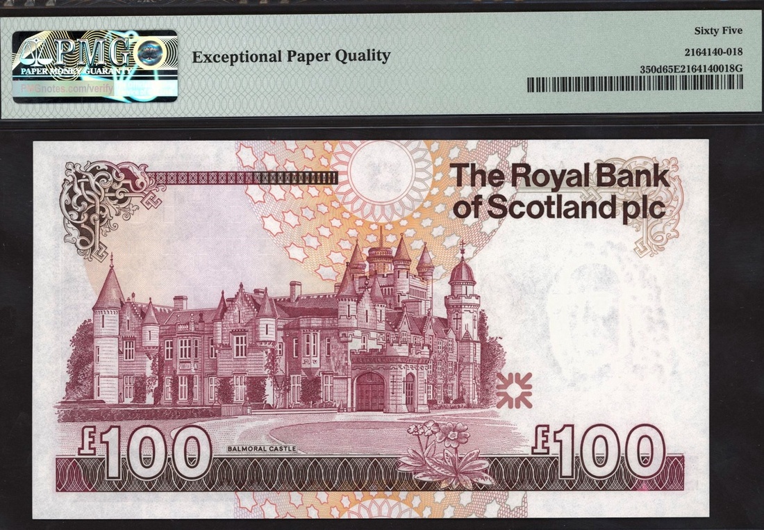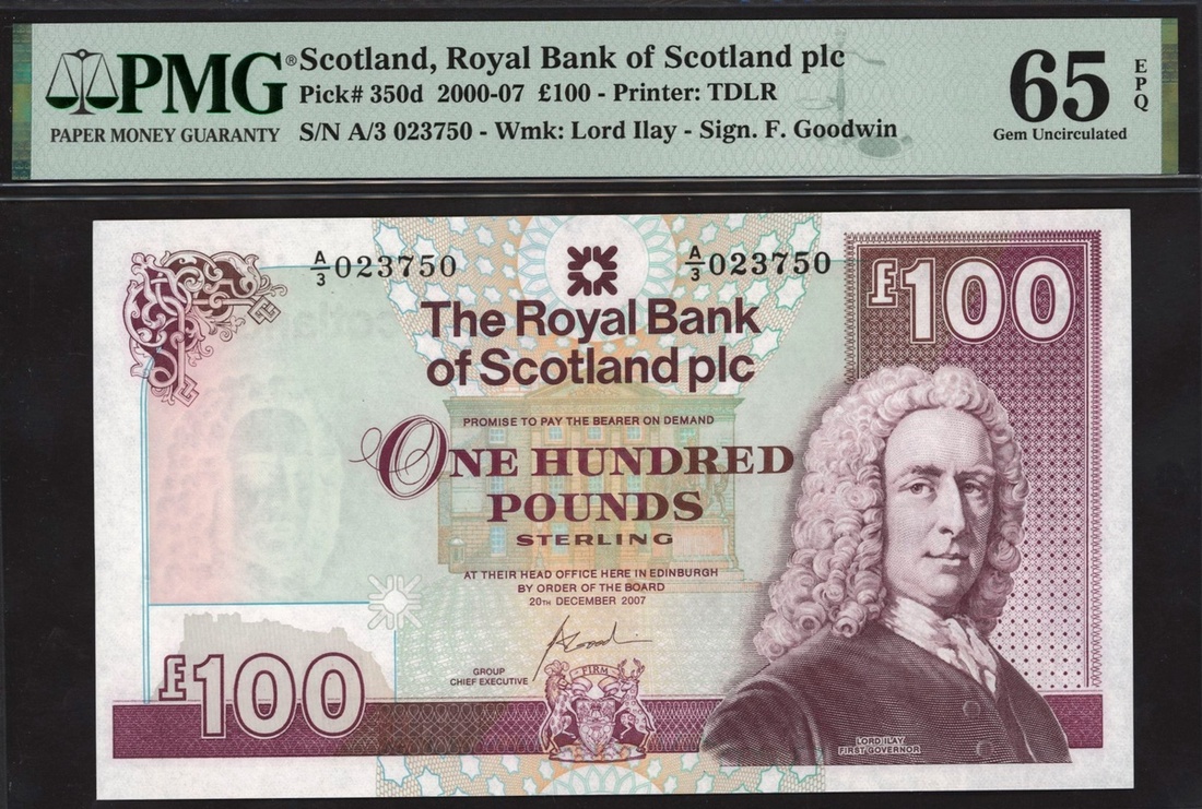 Royal Bank of Scotland, £100, 20 December 2007, serial number A/3 023750, (PMS RB109c, Pick 350d), in PMG holder 65 EPQ Gem Uncirculated