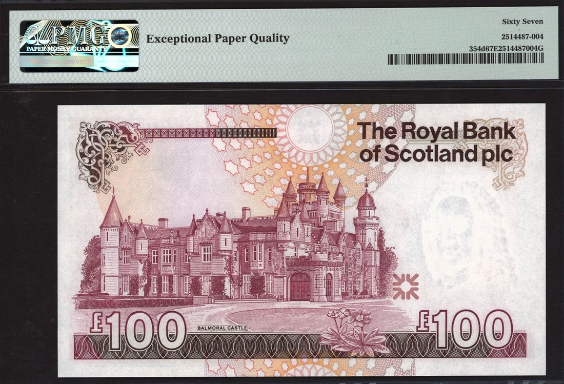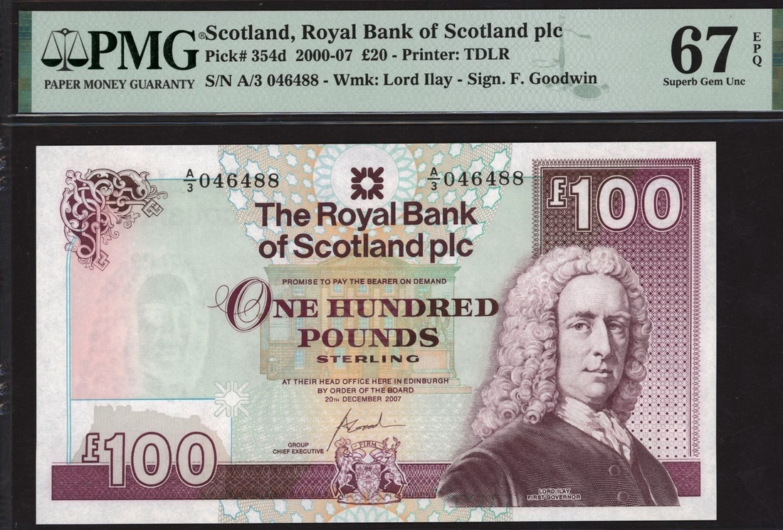 (x) Royal Bank of Scotland Plc. £100, 20 December 2007, serial number A/3 046488, (PMS RB109c, Pick 350d), in PMG holder 67 EPQ Superb Gem Unc, less than 10 examples in a higher grade on PMG Census. Note that the Pick is incorrectly stated on the PMG label.