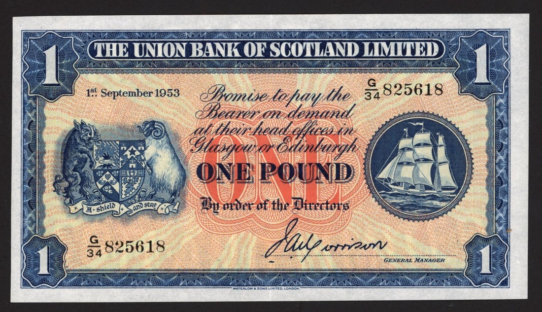 (x) Union Bank of Scotland, £1, 1 September 1953, serial number G/34 825618, (PMS UB68a), lightly pressed, centre crease, good extremely fine