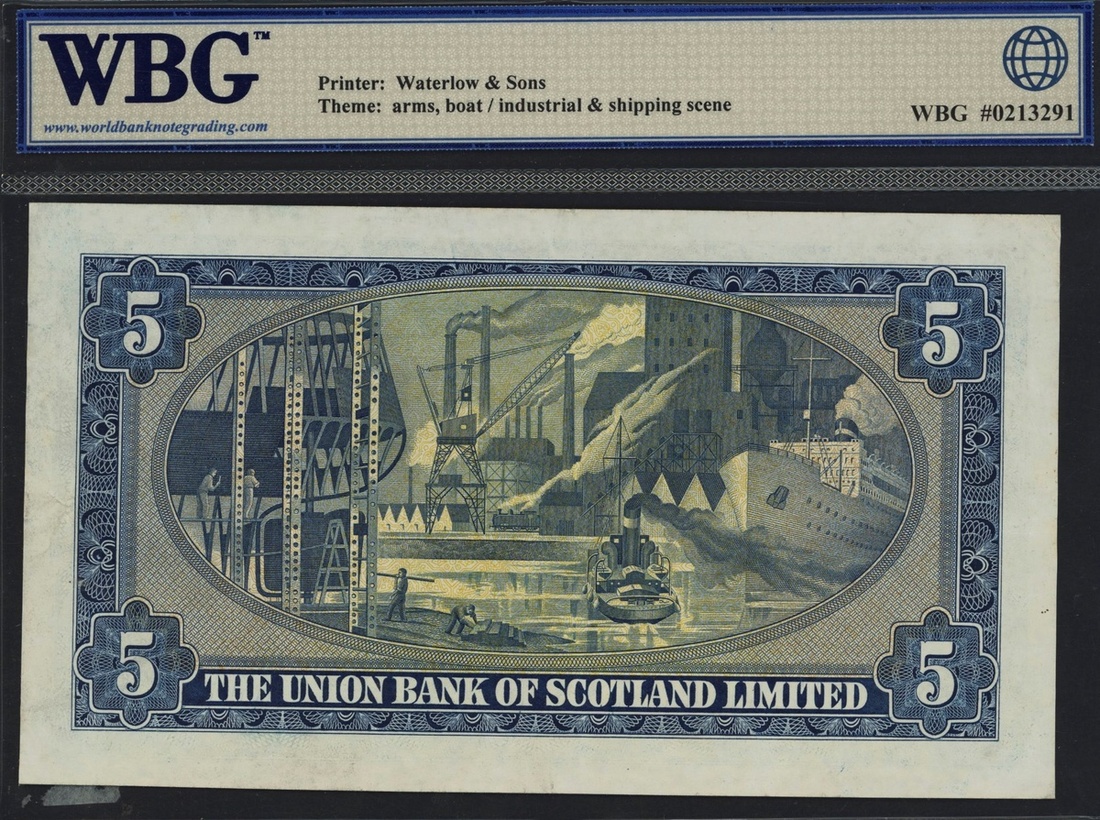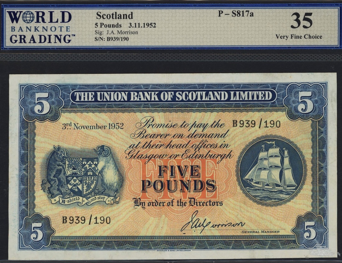(x) Union Bank of Scotland Limited, £5, 3 November 1952, serial number B 939/190, (PMS UB69a, Pick S817a), in WBG holder 35 Very Fine Choice