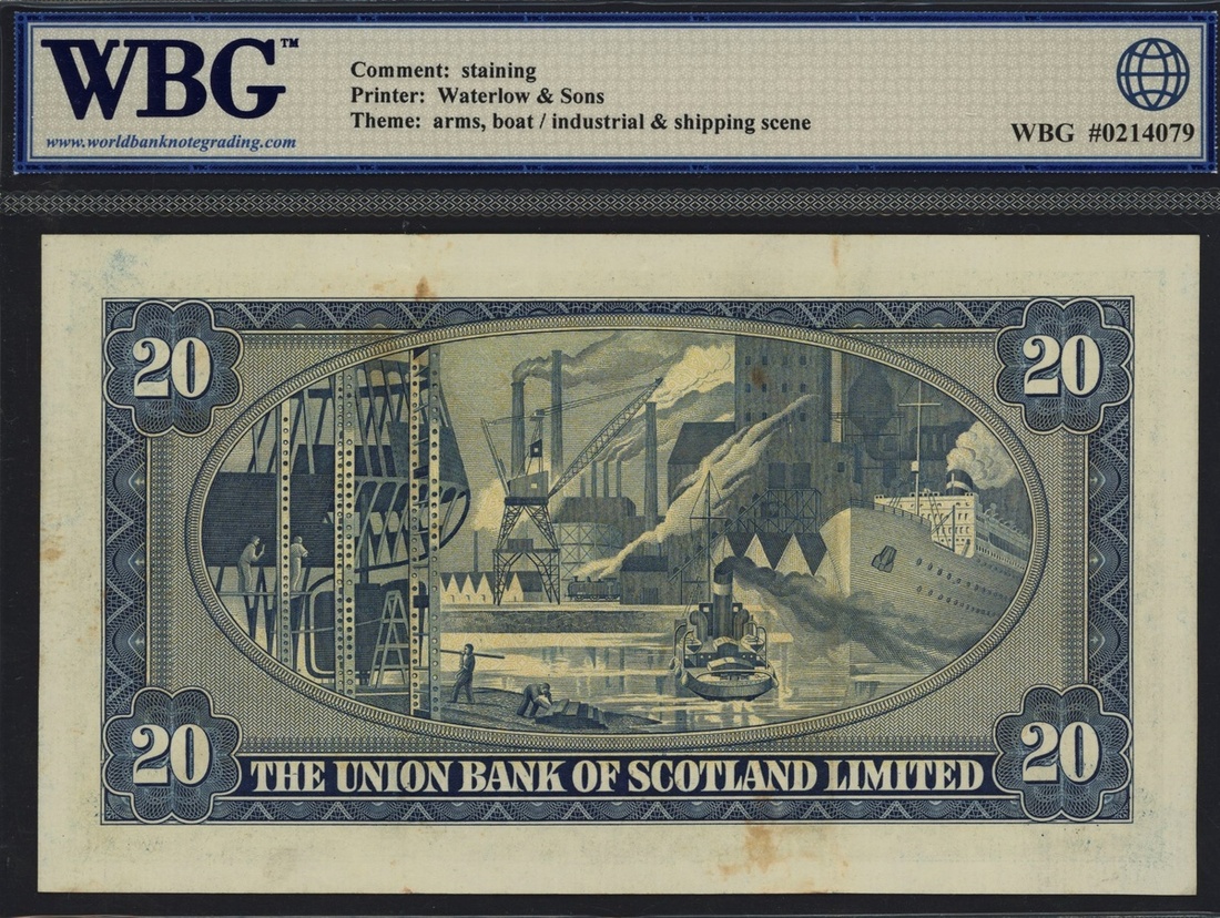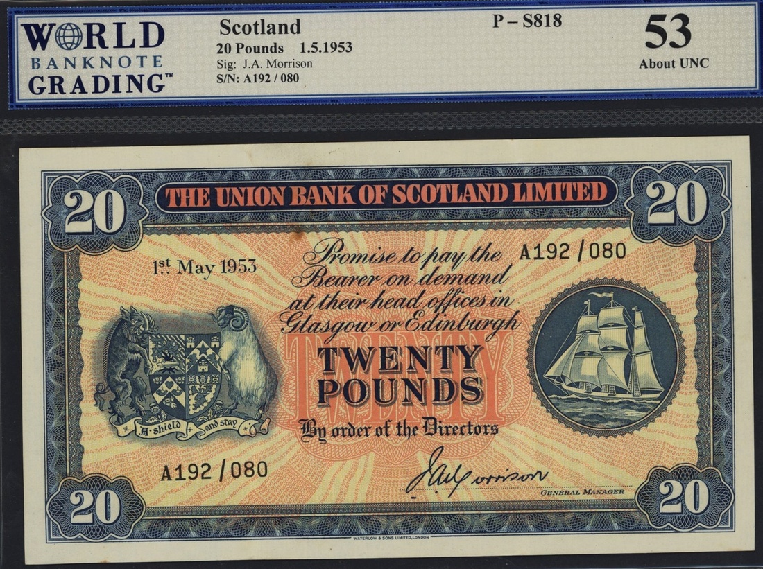 (x) Union Bank of Scotland Limited, £20, 1 May 1953, serial number A192/080, (PMS UB70, Pick S818), in WBG holder, staining, 53 About UNC, scarce in this grade