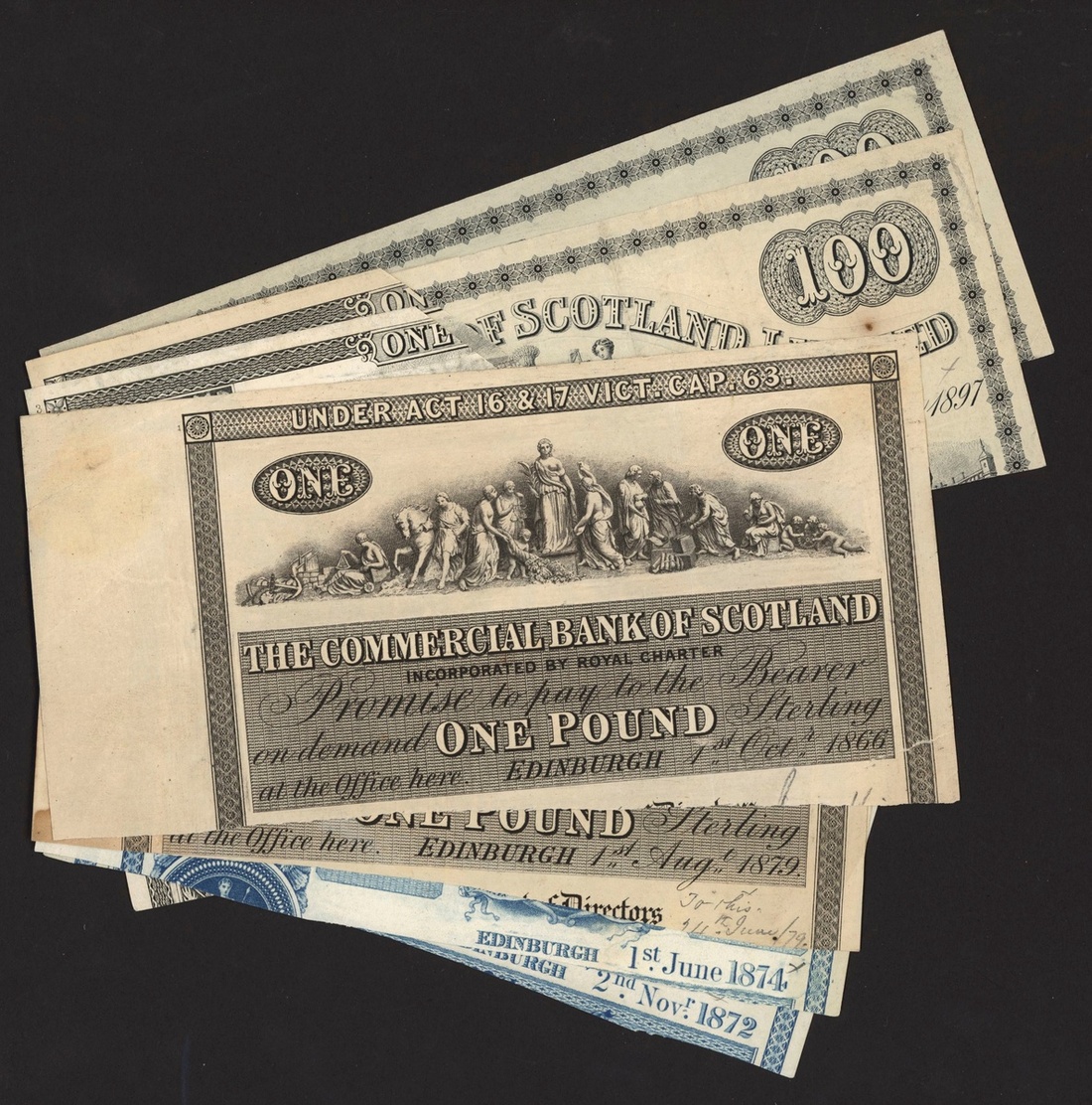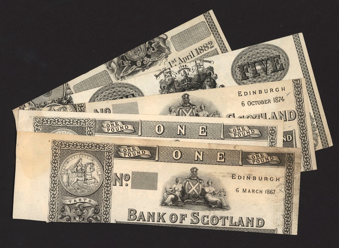 A group of Scottish cut proofs, including Bank of Scotland £1 (2) 1867, 1879, £20 1874, British Linen Company £1 (3) 1872, 1874, 1882, £5 1887, Commercial Bank of Scotland £1 (2) 1866, 1879, Town and County Bank £1 (2), 1892, 1903, Union Bank of Scotland £100 (2) 1897, 1900,