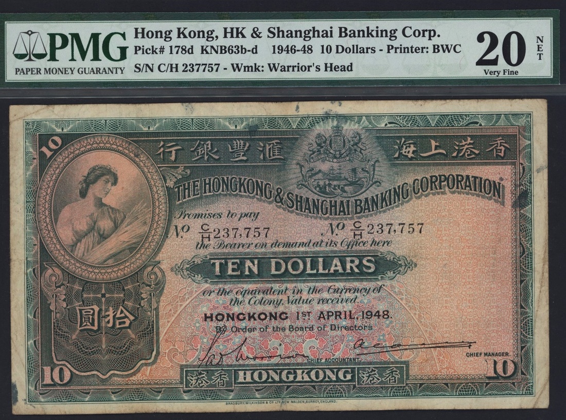 (x) Hong Kong, 10 dollars, 1948, serial number C/H 237757, (Pick 178d), in PMG holder 20 NET Very Fine, ink