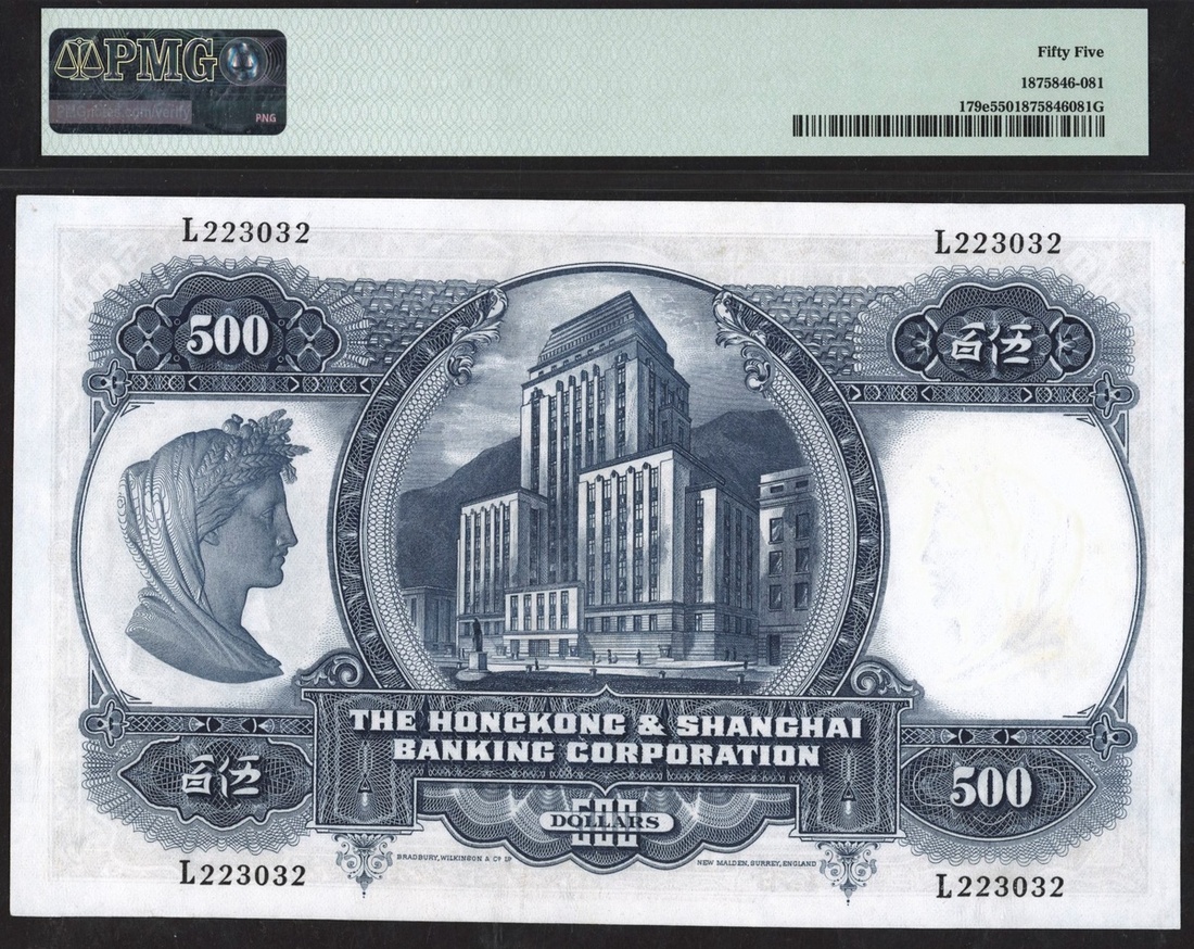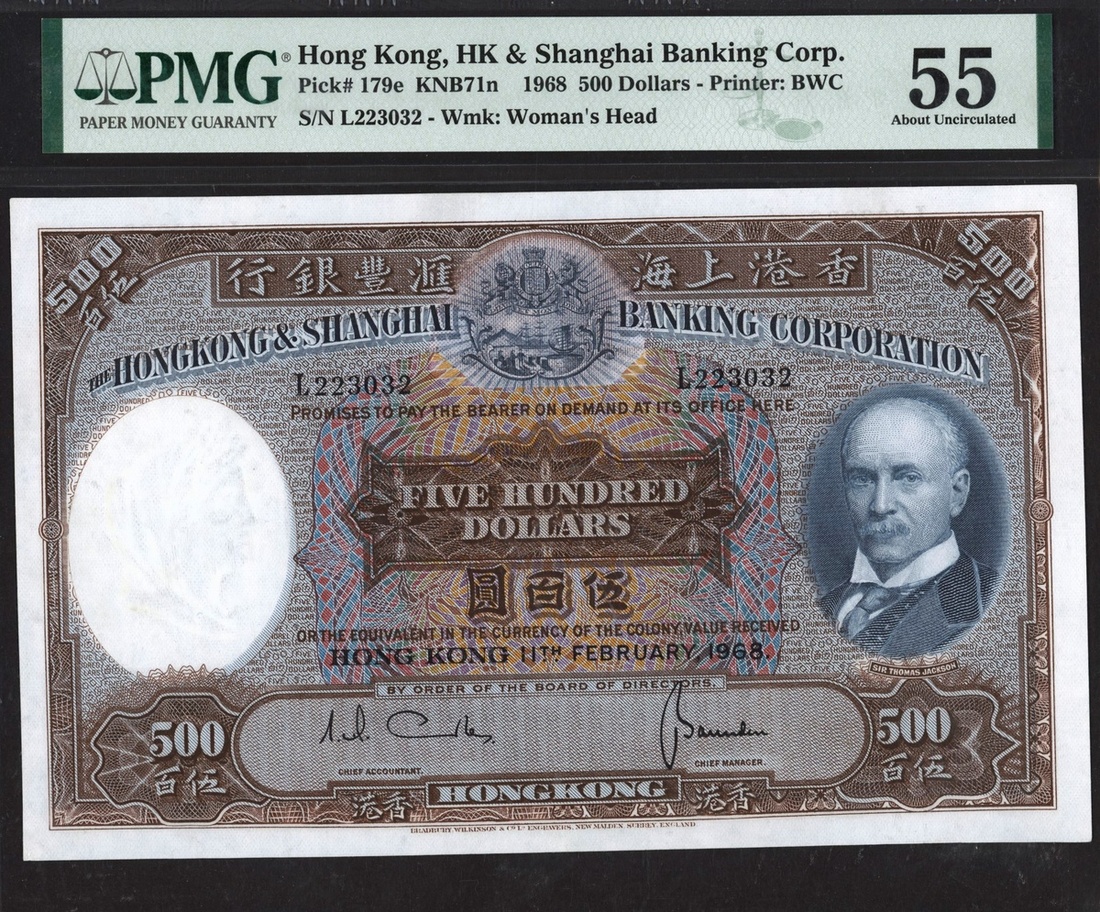 (x) HongKong & Shanghai Banking Corporation, 500 dollars, 11 February 1968, serial number L223032, (Pick 179e), near last date, last prefix, in PMG holder 55 About Uncirculated