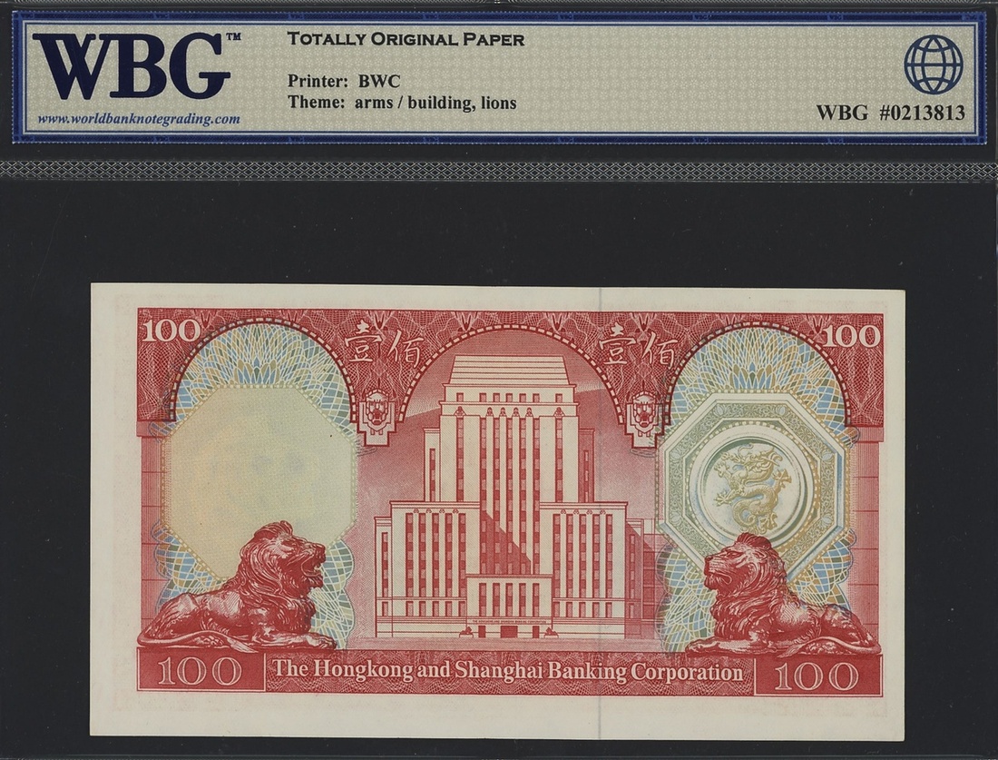(x) The HongKong and Shanghai Banking Corporation, 100 dollars, 1978, serial number 450238 XN, (Pick 187a), in WBG holder 64 TOP UNC Choice