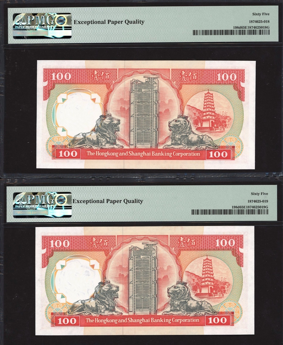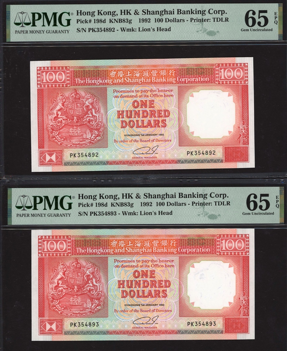 (x) HongKong and Shanghai Banking Corporation, consecutive $100 (2), 1992, prefix PK, (Pick 198d), in PMG holders 65 EPQ Gem Uncirculated (2 notes)