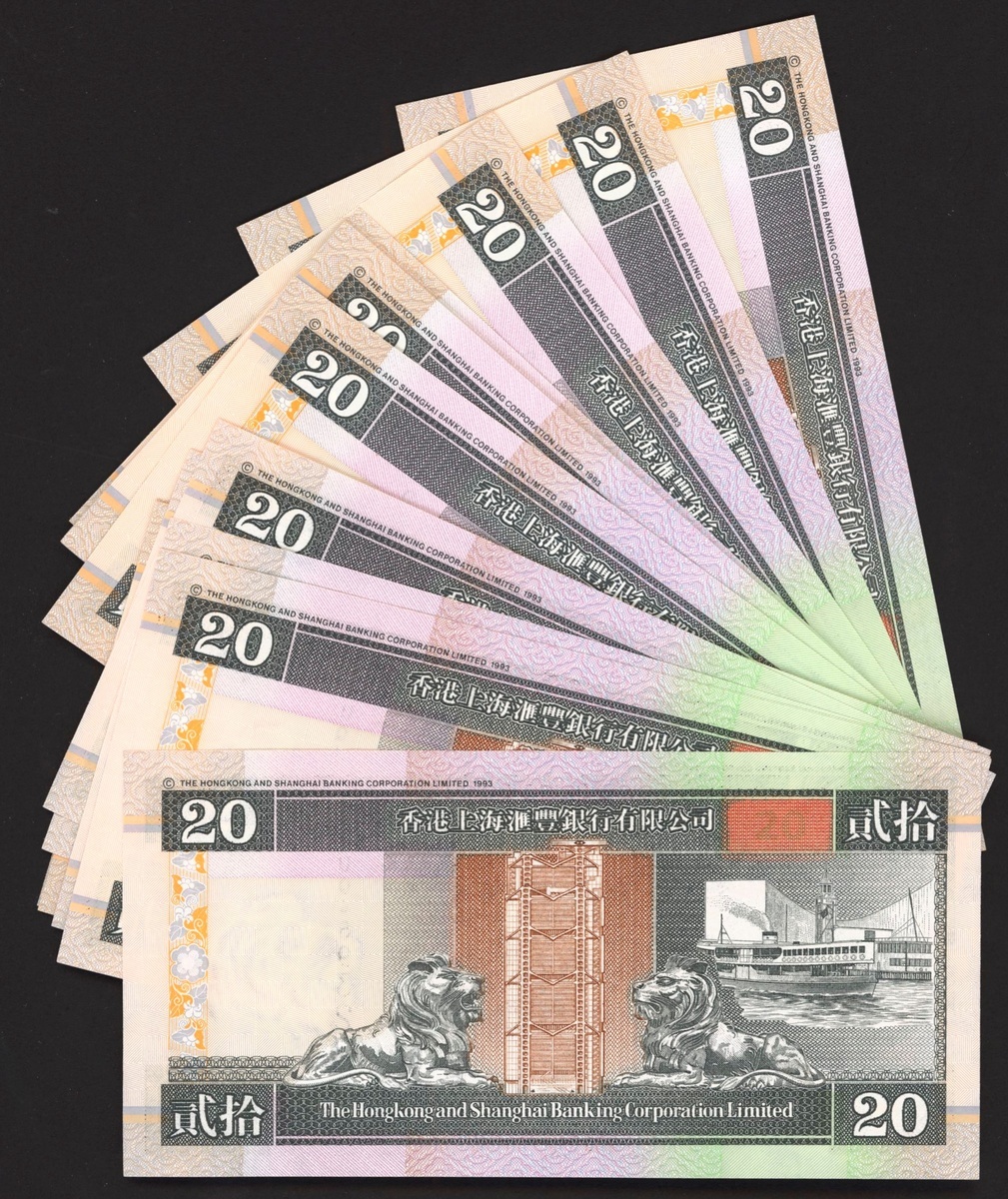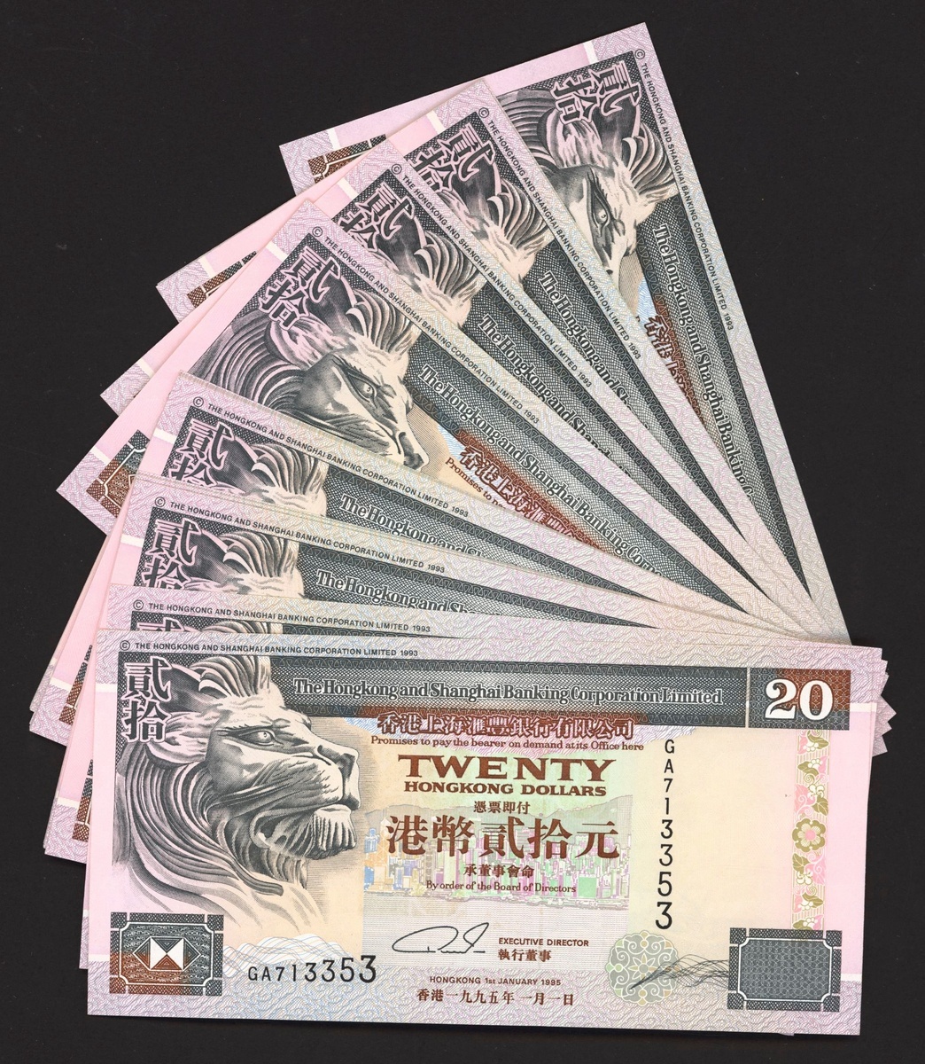 (x) HongKong and Shanghai Banking Corporation, $20 (34), 1995-2002, prefix GA, DW, LA, UQ, (Pick 201), includes consecutive runs, uncirculated (34 notes)