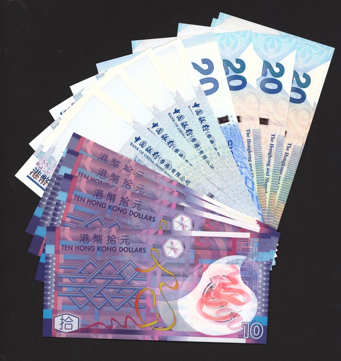 (x) Hong Kong, a group of interesting matching number sets, including HSBC $20 (2) serial numbers 690213, $20 (2) serial numbers 280088, Standard Chartered $20 (2) serial numbers 975229, Hong Kong Government, polymer $10 (3) serial numbers 007041, $10 (2) serial numbers 005202, Bank of China 2009, $20 (3) serial numbers 819379, $20 (2) serial numbers 819973,