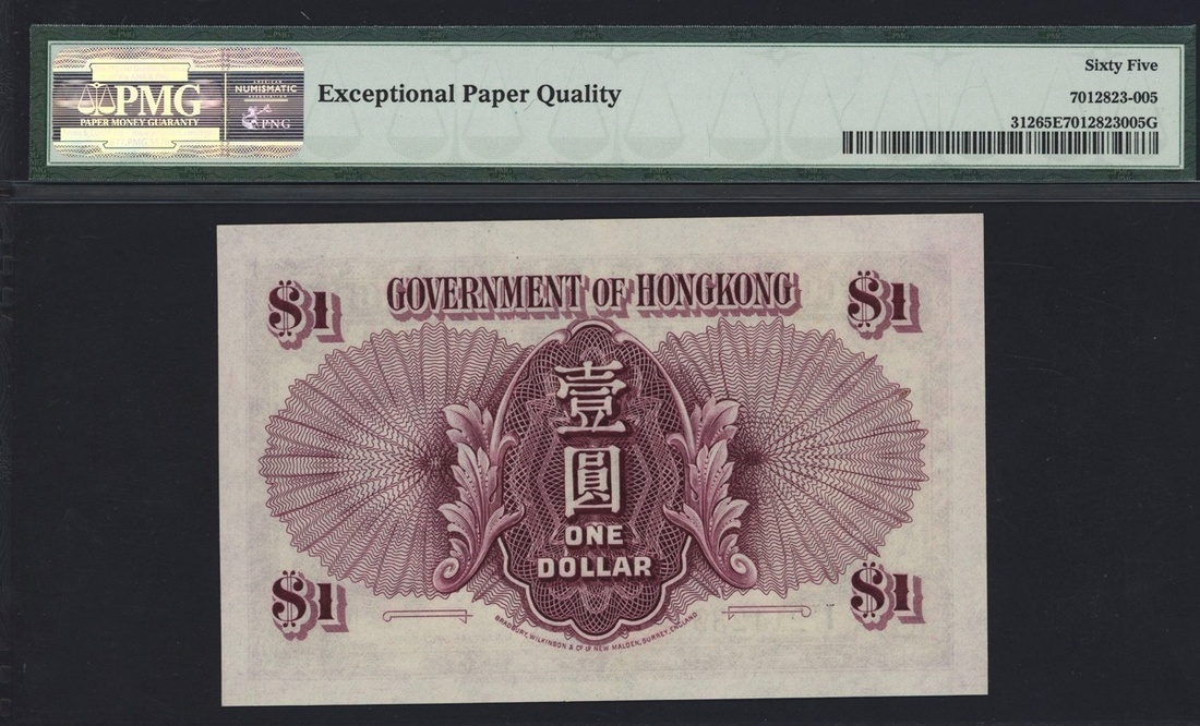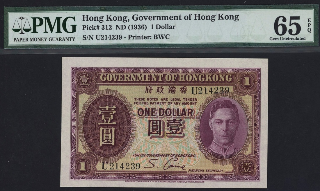 Government of Hong Kong, 1 dollar, ND (1936), serial number U214239, (Pick 312), in PMG holder 65 EPQ Gem Uncirculated