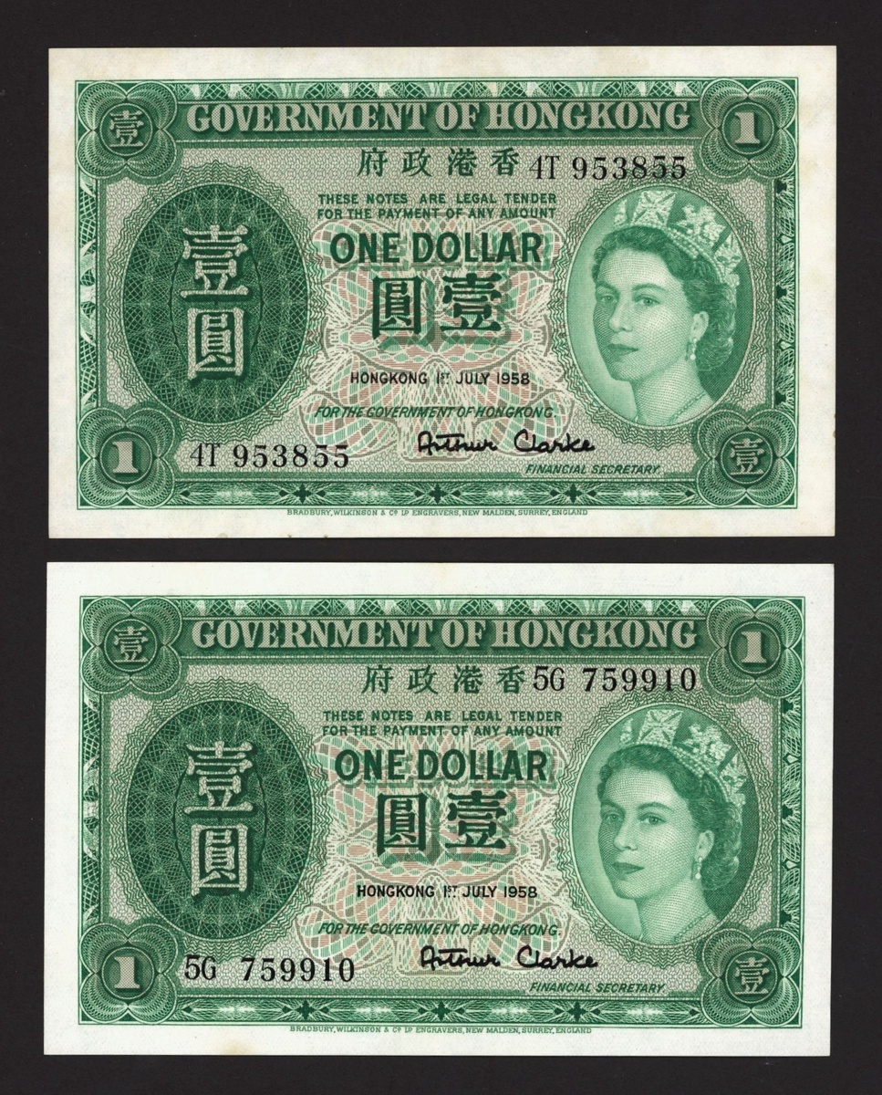 (x) Government of Hong Kong, 1 dollar (2), 1 July 1958, prefix 4T, 5G, (Pick 324Ab), one with light centre crease, good extremely fine, the other uncirculated (2 notes)