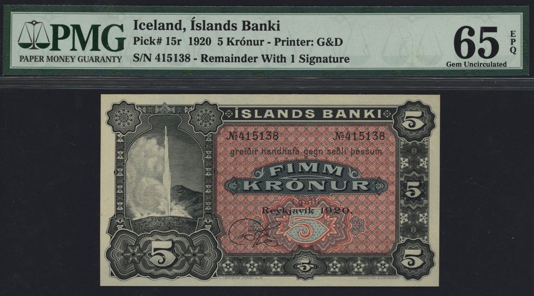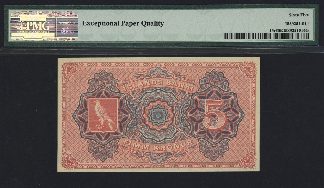 (x) Icelands Banki, Iceland, 5 kronur, 1920, serial number 415138, (Pick 15r), in PMG holder 65 EPQ Gem Uncirculated