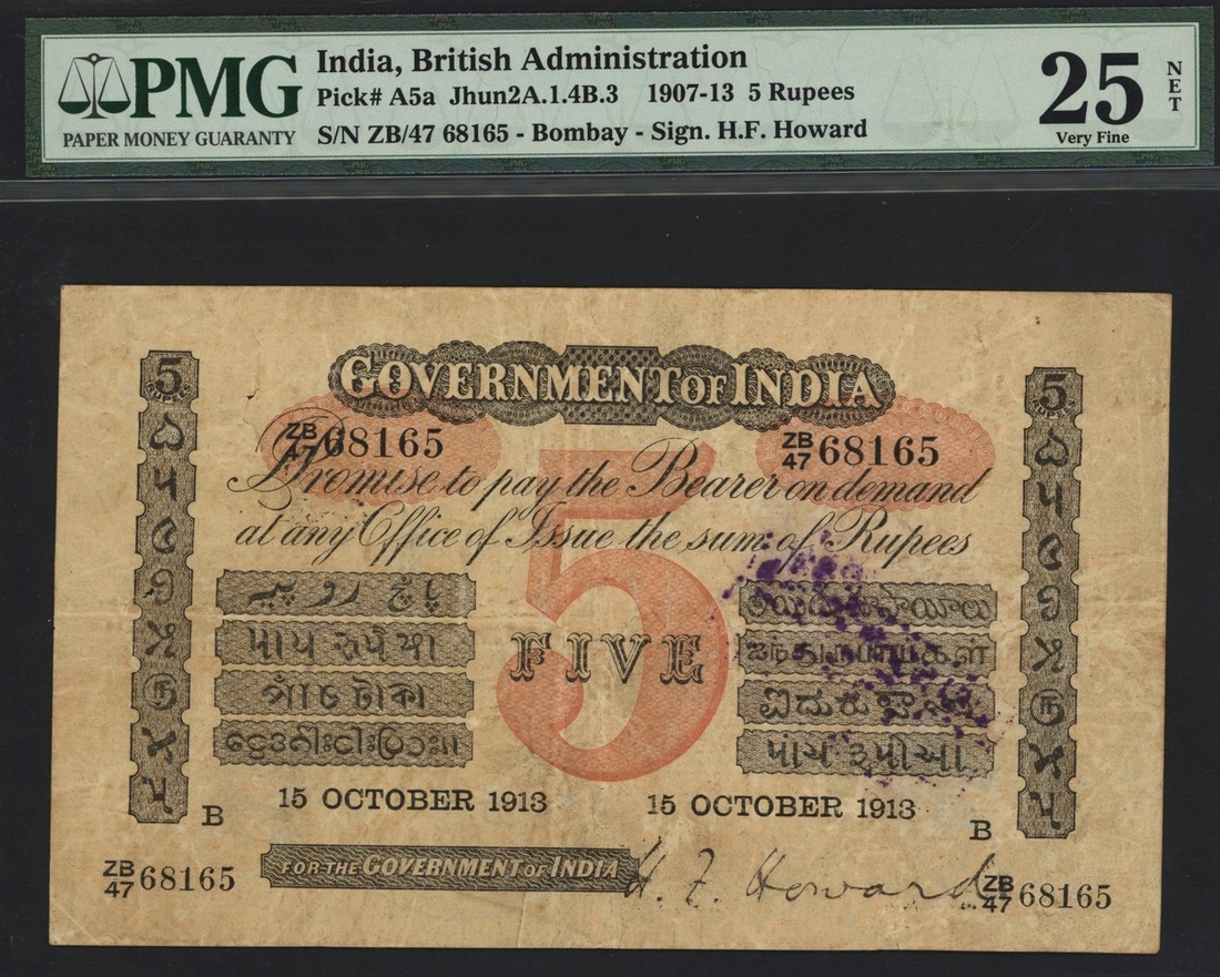 (x) Government of India, 5 rupees, Bombay, 15 October 1913, serial number ZB/47 68165, uniface, signature Howard,