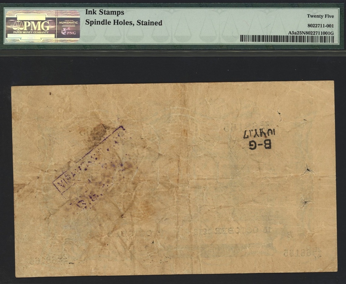 (Pick A5a, Razack-Jhunjhunwalla 2A.1.4B.3, BNB 131b3), in PMG holder, ink stamps, spindle holes, stained, 25 NET Very Fine.