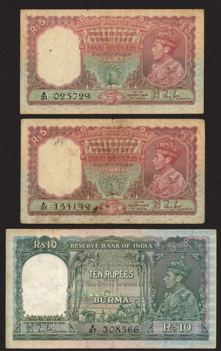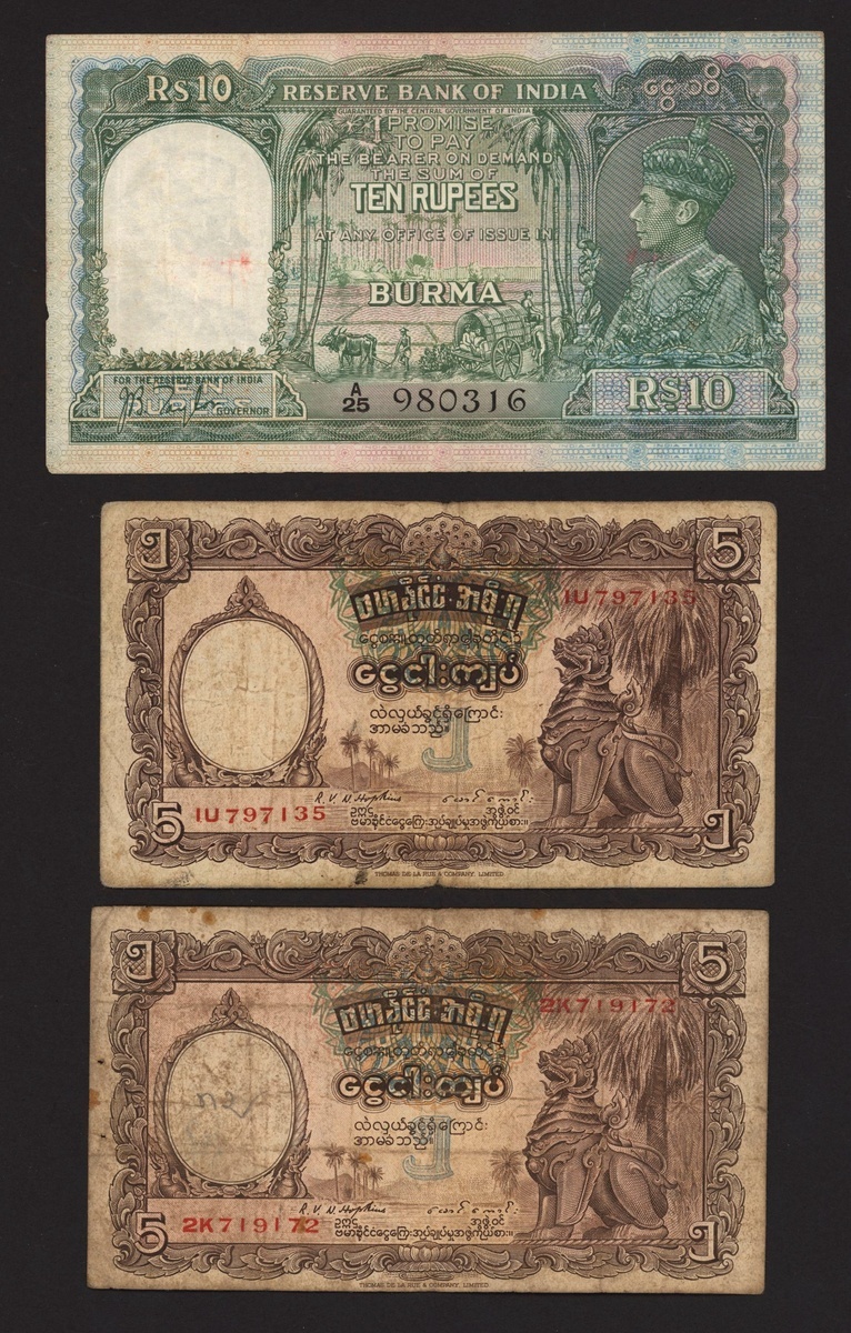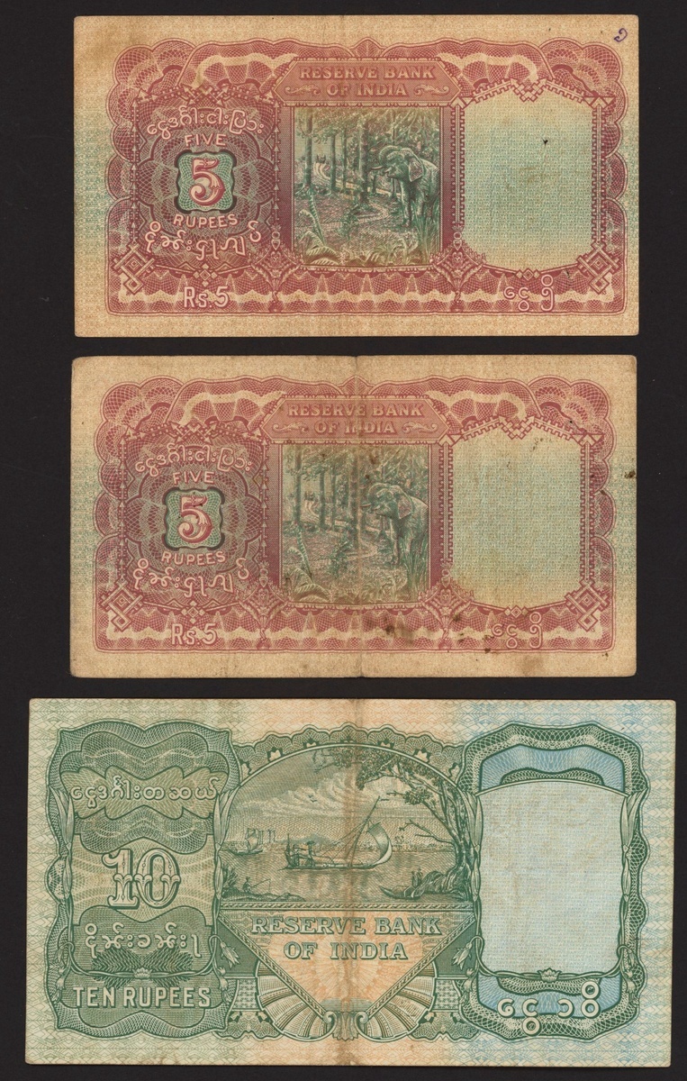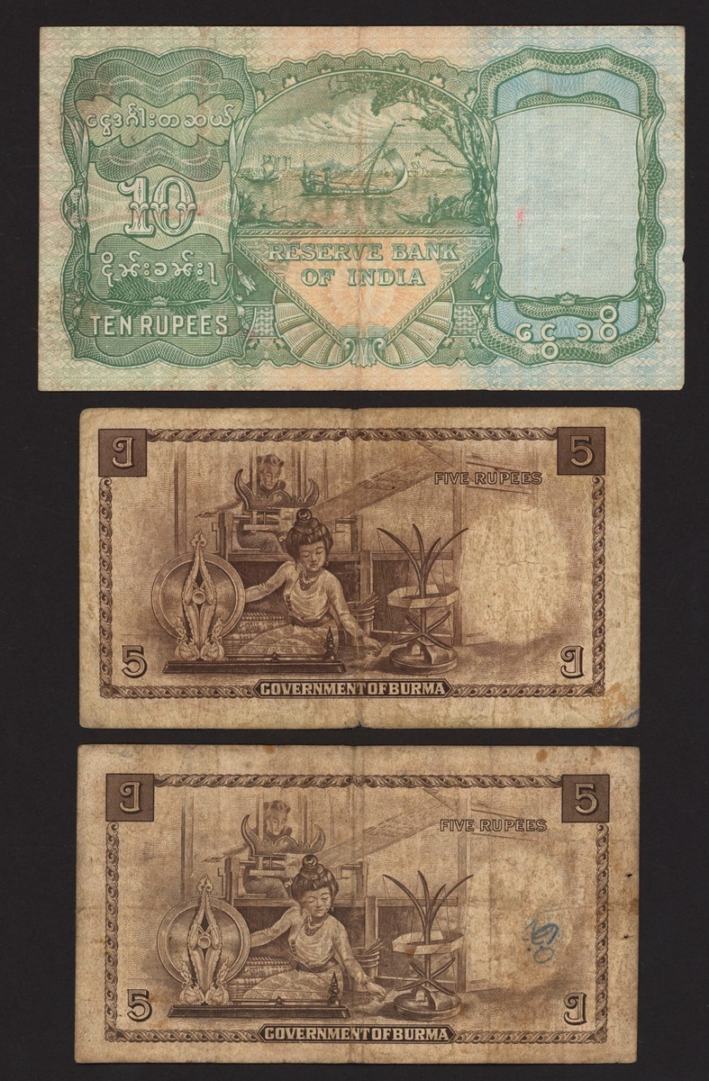 (x) Reserve Bank of India, Burma, 5 (2) rupees, and 10 (2) rupees, ND (1938-39), Also Government of Burma 5 rupees (2) ND (1948),