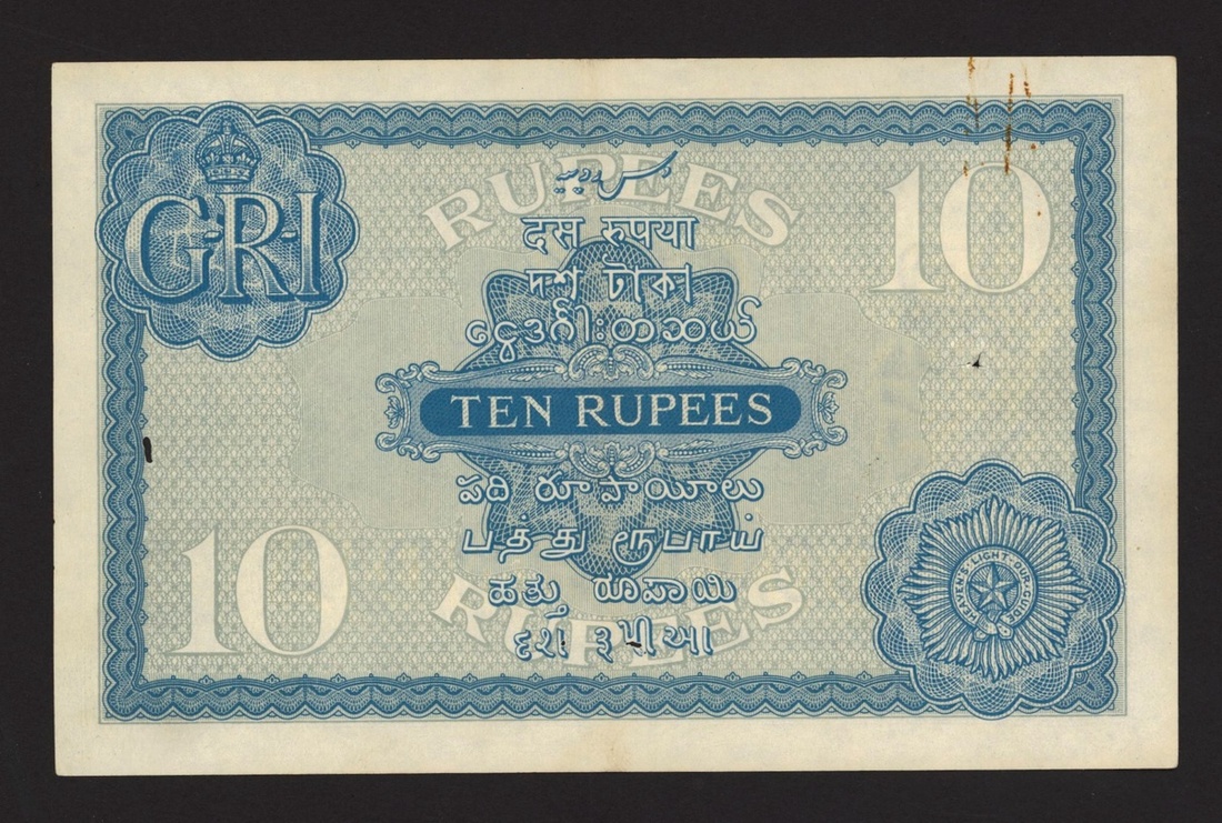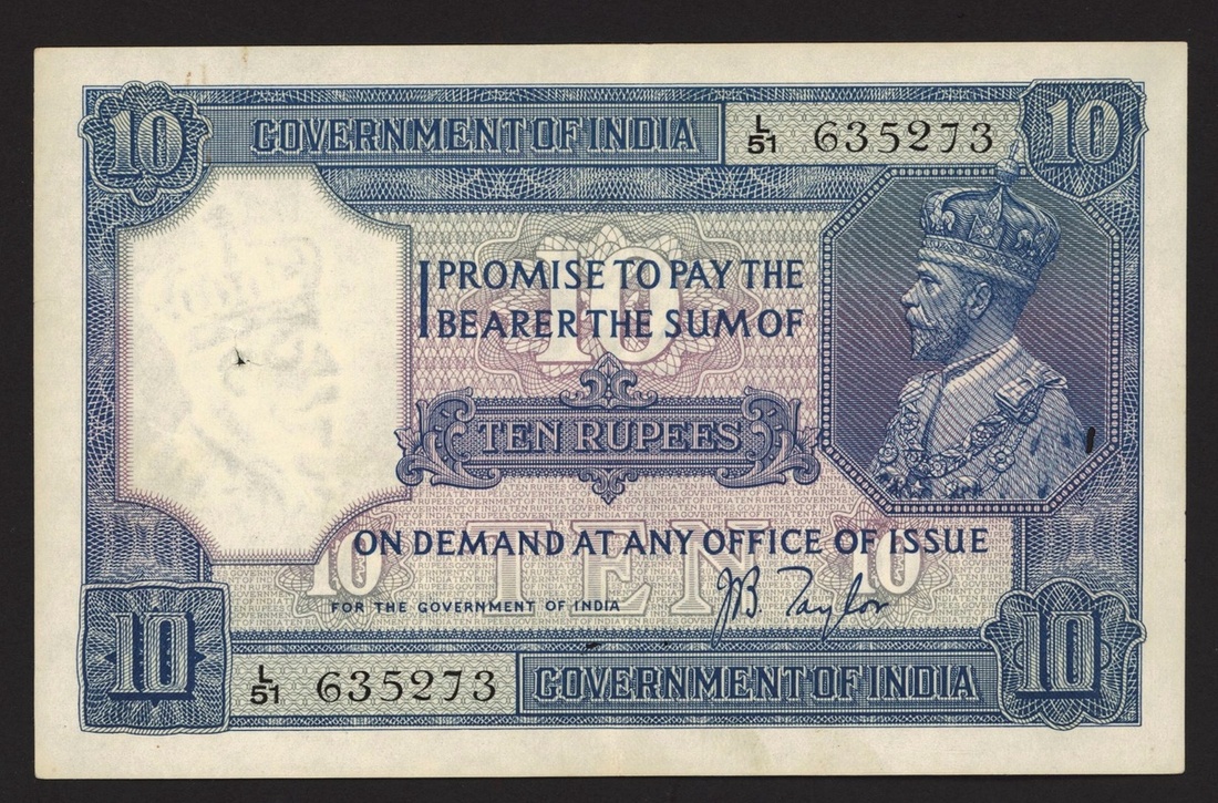 (x) Government of India, 10 rupees, ND (1926), serial number L/51 635273, blue, lilac and pale grey-green, bust of George V top right, Taylor signature low right