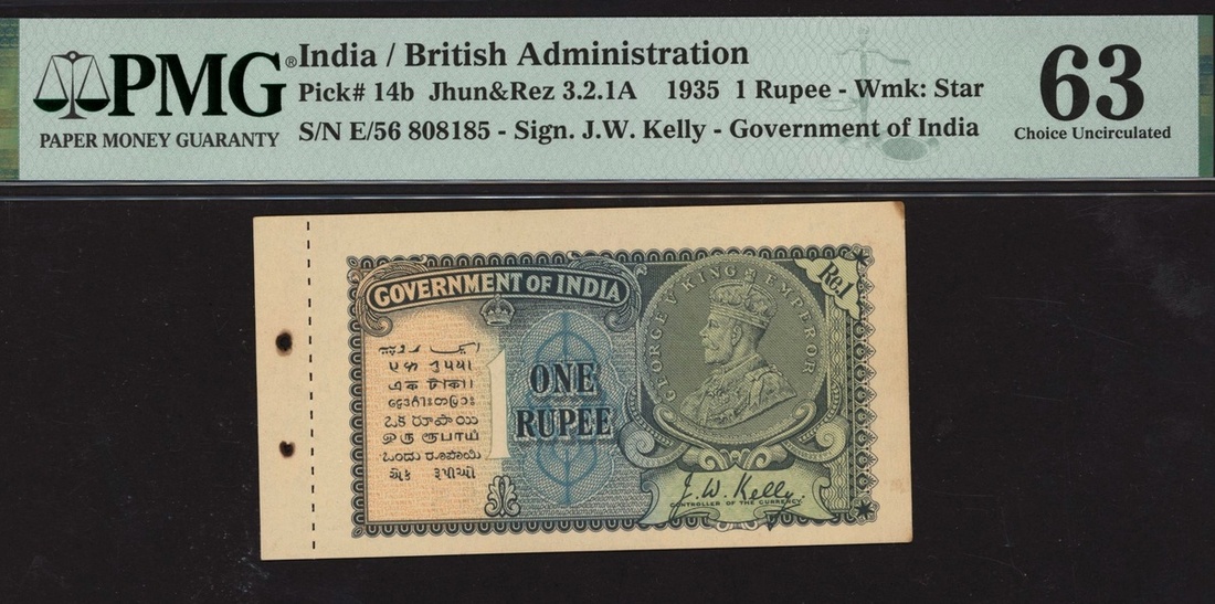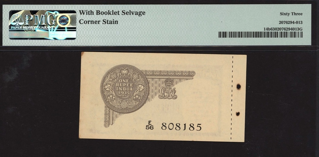 (x) Government of India, 1 rupee, 1935, serial number E/56 808185, (Pick 14b, BNB 148d), in PMG holder, with booklet selvage, corner stain, 63 Choice Uncirculated