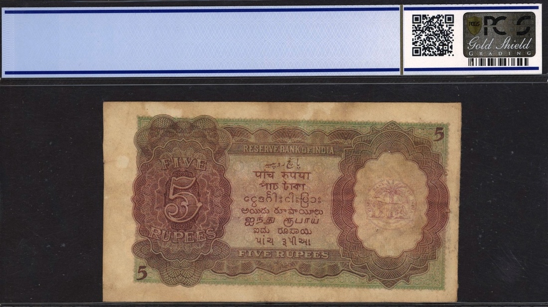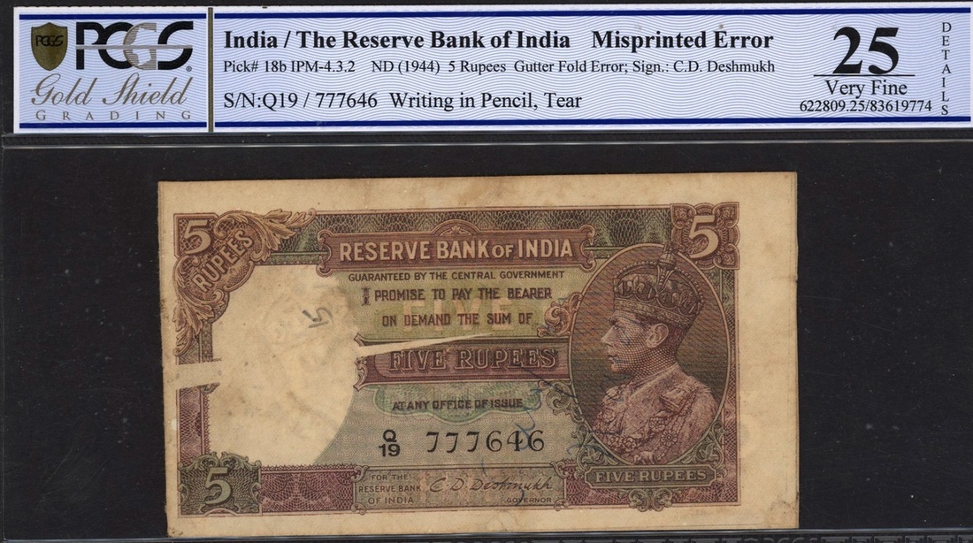 Reserve Bank of India, forgery/misprinted error, 5 rupees ND(1944), serial number Q19 777646, (Pick 18b, IPM 4.3.2), in PCGS Gold Shield, 25 Very Fine, writing in pencil, tear - however the note is a forgery