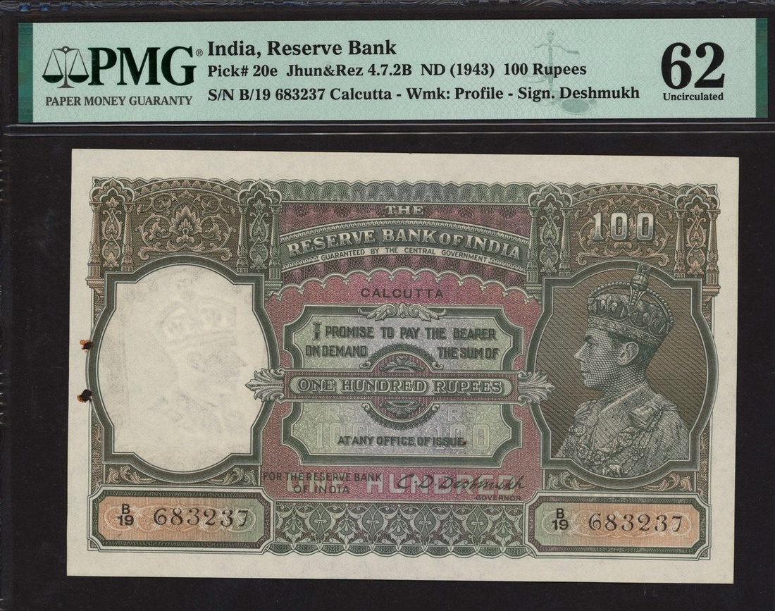 (x) Reserve Bank of India, 100 rupees, Calcutta, ND (1943), serial number B/19 683237, signature Deshmukh,