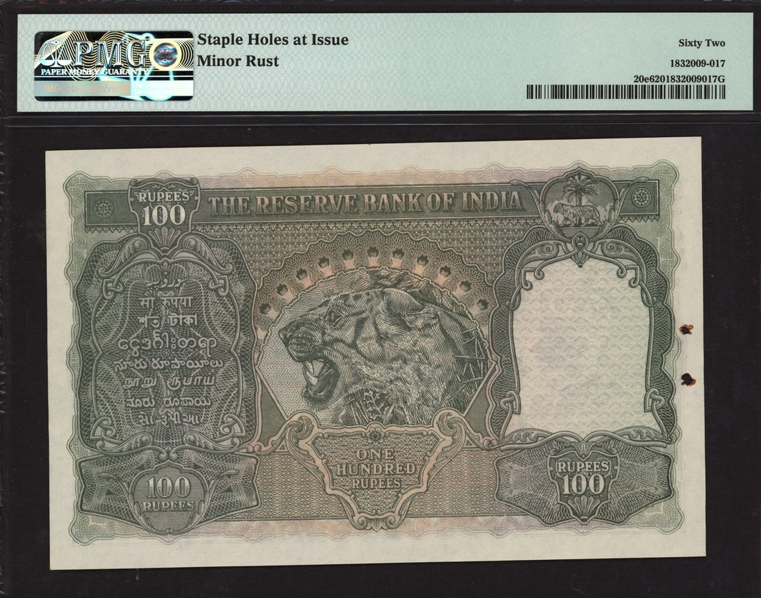 (Pick 20e, Razack-Jhunjhunwalla 4.7.2B, BNB B204b2), in PMG holder, staple holes at issue, minor rust, 62 Uncirculated. Scarce in this grade