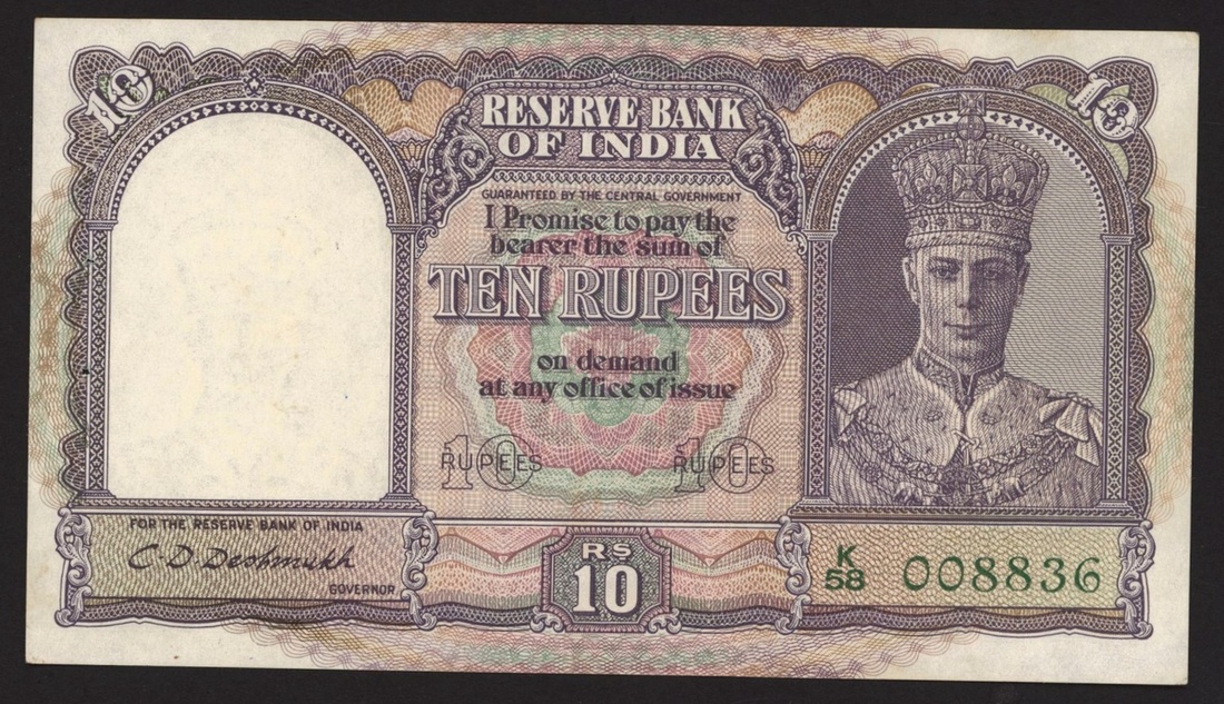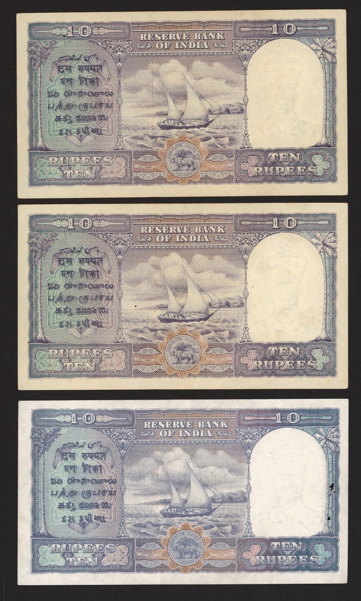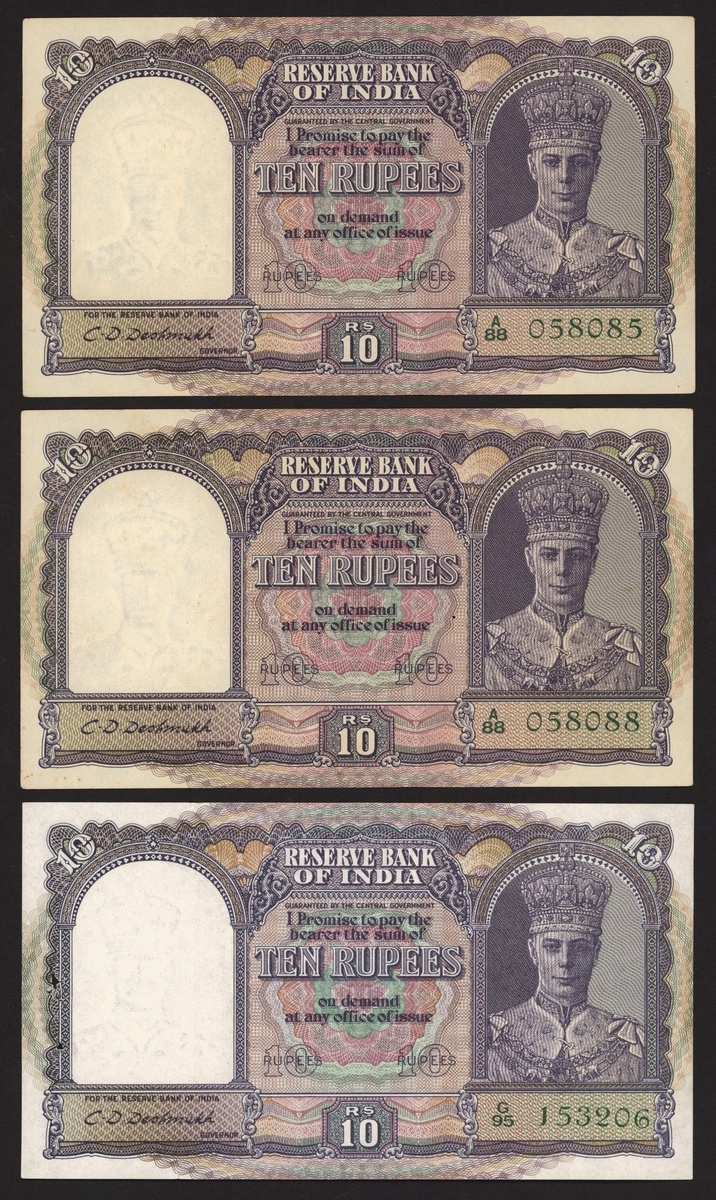 Reserve Bank of India, 10 rupees (4), ND (1944), prefixes A, G, K, (Pick 24), usual staple holes, one with a larger hole, pressed about extremely fine (4 notes)