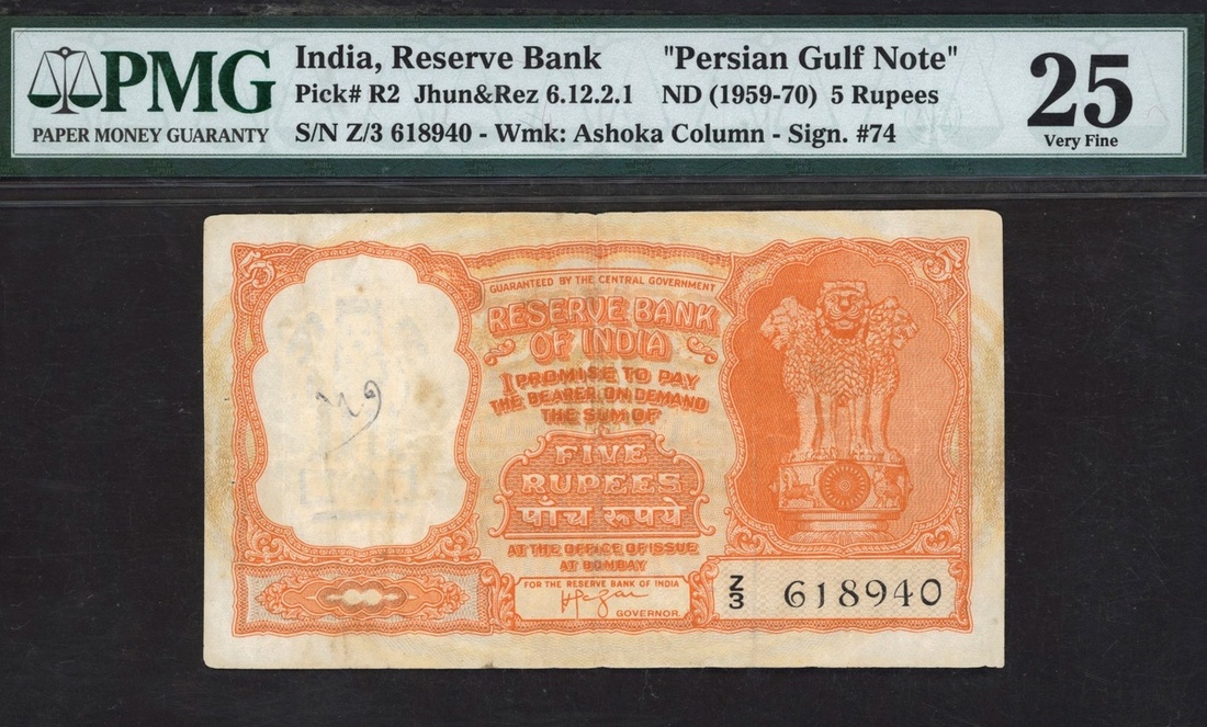 (x) Reserve Bank of India, 5 rupees, ND (1959-70), serial number Z/3 618940, (Pick R2), in PMG holder 25 Very Fine, staple holes at issue, annotation