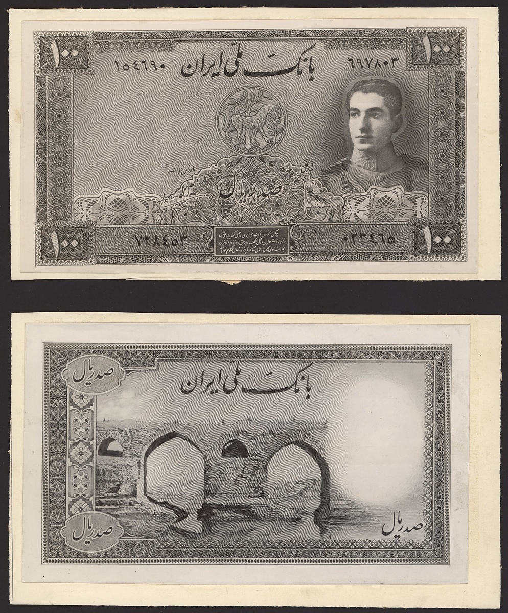 Bank Melli Iran, a pair of Printer's Archival Photographs of unadopted designs for the 100 Rials, ca. 1943-44, black and white, obverse with Shah Mohammad Reza Pahlavi at left, reverse showing the Sasanian bridge at Dezful,