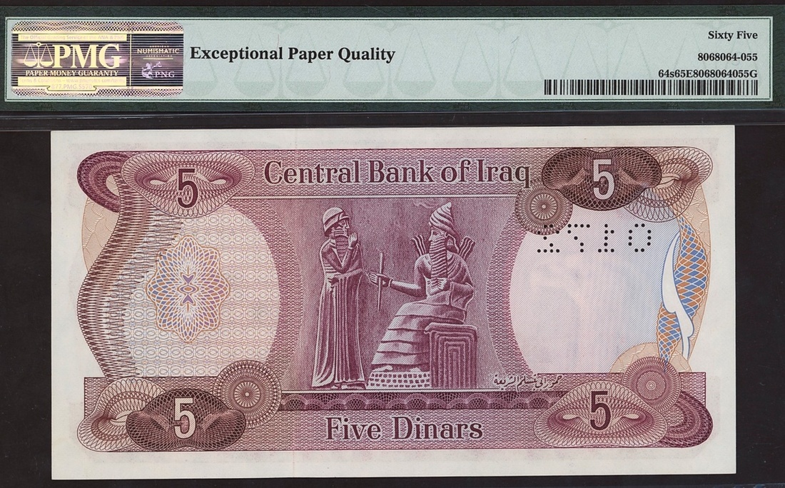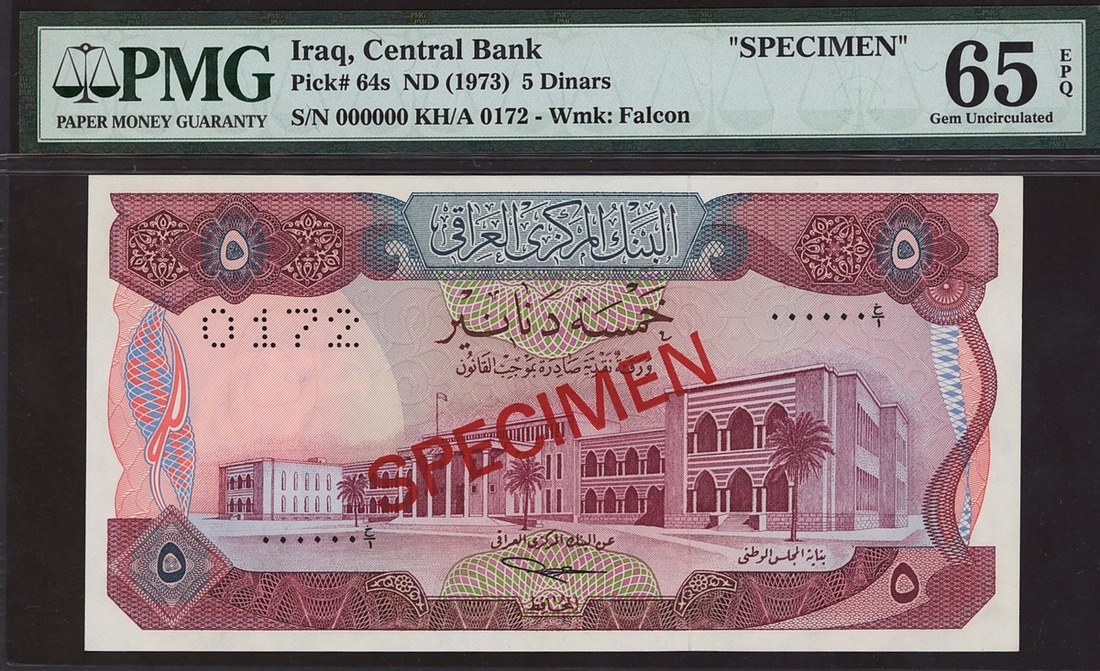 (x) Central Bank of Iraq, [Top Pop] specimen 5 dinars, ND (1973), serial number 000000 KH/A 0172, (Pick 64s, BNB B321s), in PMG holder 65 EPQ Gem Uncirculated (0 finer)