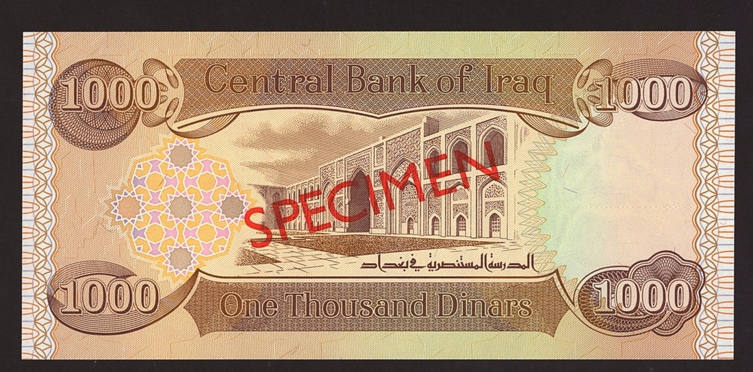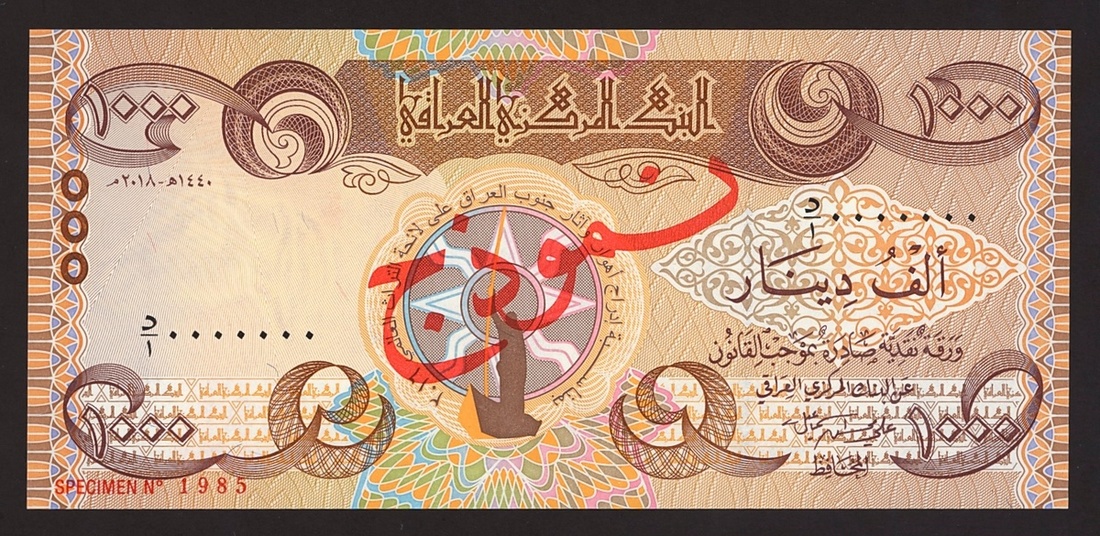 (x) Central Bank of Iraq, Specimen 1,000 dinars, 1985, serial number 0000000, (Pick 93s), about uncirculated,